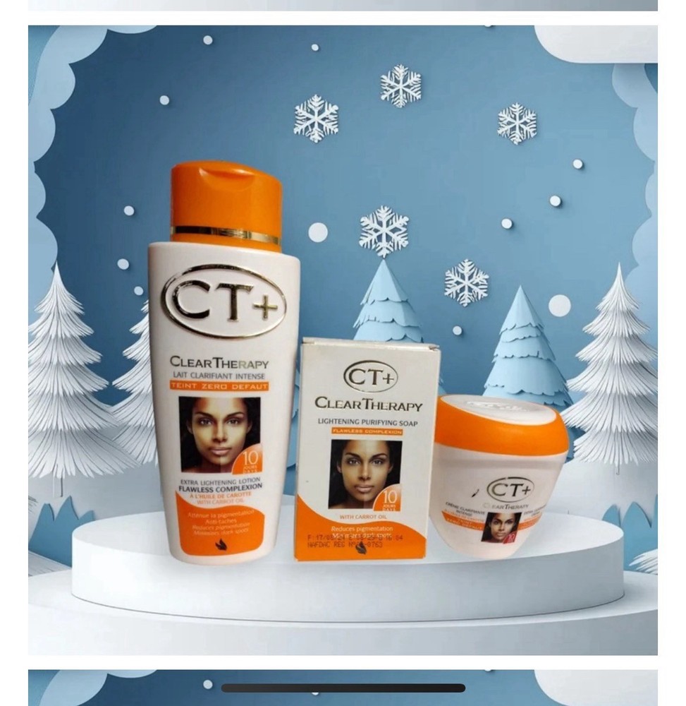 The Ct Clear Therappy Extra Lightening Skin Cream, Lotion, and Soap Set by PLUS is designed specifically for daily use to target dark spots. The formulation includes glycerin, providing hydration for the skin. With a UVA protection of 1-star, this set is ideal for achieving a brighter and clearer complexion. The compact set includes all the necessary products for a daily skincare routine, making it convenient for users to treat their skin effectively.