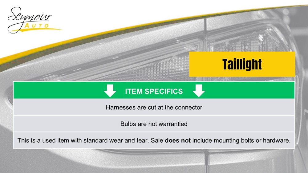 Hollander Welcome to our eBay store! Driver Tail Light Quarter Panel Mounted Fits 05-06 ALTIMA 1426042 Description This is a Used Taillight removed from a salvage vehicle. This is sold as the Taillight Assembly only. It does not include the plug, bulb, or harness. If these items are left on, they are from convenience only and not covered by our warranty. You are covered by our 6 Month Part Warranty. LEFT IS DRIVERS SIDE AND RIGHT IS THE PASSENGERS SIDE. This taillight has been inspected and is functional, however it may have slight scuffs, scratches, or blemishes. Please contact us with any questions your may have! Donor Vehicle Model : ALTIMA Year : 2005 Mileage : 0 (0 = not available or unknown) Stock Number : 06413 Notes : LH This Part Will Fit These Makes And Models With These Options ALTIMA 05-06 (quarter panel mounted), exc. SE-R; L. About Us Payment Shipping Returns Warranty About Us We are a locally owned business with over 70 years of experience in the automotive industry with an extensive collection of used car parts and accessories for thousands of different vehicles. Our knowledgeable and caring staff work hard every day making sure all of our parts are high quality and functional to fit your needs. We are happy to verify fitment for you prior to purchase via your vehicle’s VIN (Vehicle Identification Number). Please contact us with any questions prior to purchasing. Orders are sent to the shipping department throughout the day therefore we cannot guarantee adjustments to orders after payment is received. Payment Payment details: Please contact us with any questions prior to purchasing. Orders are sent to the shipping department throughout the day therefore we cannot guarantee adjustments to orders after payment is received. All orders must be paid in full prior to shipment. Payments are processed through eBay by eBay. If payment is not received within a reasonable time from when the order is placed, it will be cancelled without notice. All purchase prices are final. No price match or discount can be made while an item is awaiting payment. Shipping Shipping Details: FREIGHTED ITEMS MUST BE SHIPPED TO A COMMERCIAL ADDRESS WITH A LOADING DOCK AND A FORKLIFT, ABLE TO REMOVE THE PALLET FROM THE TRUCK. WE ALSO COULD FREIGHT TO A LOCAL FREIGHT TERMINAL. PLEASE CONTACT US FOR RATES ON FREIGHTED ITEMS. Items are shipped after being paid in full. We only ship to US addresses within the continental 48 states. Shipping to AK, HI and PO Box's require a special rate and are subject to additonal charges. All parts listed with Free Shipping have a one day handling time and may not be picked up by the carrier the same day the part is ordered. Any estimated delivery dates provided are only estimates and are not guaranteed to be accurate. We are not responsible for any delays with UPS, Fed-Ex or USPS. We must be contacted same day if an item is received damaged. All address changes must be completed before the part is shipped. Address changes that take place after the part has been shipped are subject to an address change fee. Overnight and expedited shipping options are available for an additional cost. All parts listed as, Pick Up Only , can be shipped if the shipping cost is covered by the buyer. All parts listed as, Pick Up Only , will be held at Seymour Auto Wrecking (107 New Haven Rd, Seymour CT 06483) for the buyer. International orders are shipped via eBay’s Global Shipping Program. We are not responsible for any shipping charge associated with eBay's Global Shipping Program. We are unable to change the delivery address on all orders shipped through eBay's Global Shipping Program. eBay must be contacted directly. We are not responsible for any delays or issues reagrding any item purchased and shipped through eBay's Global Shipping Program. Returns All parts sold have a standard 30-Day return window. Return Details: We must be contacted within 30 days of the carrier provided delivery date for the return to be accepted. No return wil be accepted if contacted after 30 days from the carrier provided delivery date. We may require more information reagrding a return request. ex: pictures, receipts, videos, etc. A free return label will not be provided for remorse return reasons. ex: changed mind, ordered by mistake/by accident, didn't like it The buyer must ship the return within 21 days of receiving a return label or starting a return. All returns must be sent in the appropriote sized box with adequate packaging. Any return received damaged may be eligible for a refund deduction. All returns made must be occompanied with a return reason. All returns that are received without a reason will not be processed. If a return label is issued by eBay, we are not responsible for reimbursing the buyer for the cost of the label. In the event the part returned does not match the original part sent, a case will be opened up with eBay. Warranty All parts come with our standard 6-month warranty. Please contact us for more details prior to ordering. The warranty begins as soon as the buyer takes possession of the part. Standard 6-Month Warranty: If a part is proven to be defective within the 6 month warranty period, a replacement or refund will be sent at our discretion. We are not responsible or liable for any incidental or consequential loss or damage. We will require more information reagrding a warranty request. ex: pictures, receipts, videos, etc. No warranty claims or reimbursement on labor. All body parts are sold as is. Any part that is damaged or altered by the buyer will not be eligible for warranty or return. No warranty claim can be made based on color or trim package. We are not responsible for the buyer's error. ex: Accidental orders, late address changes. We do not offer an extended warranty with eBay. If you experience any issue with your part, please contact us prior to attempting to repair or remove the part. Failure to do so will void the warranty. We make no claim as to the suitabili