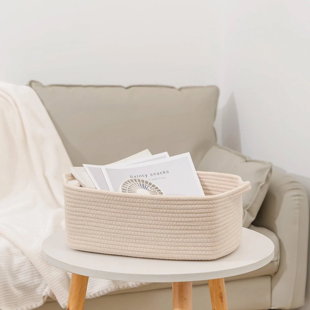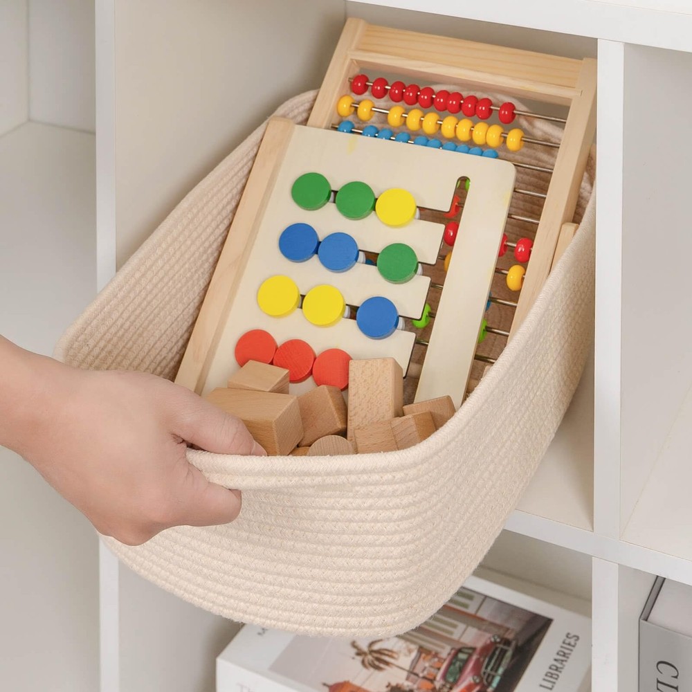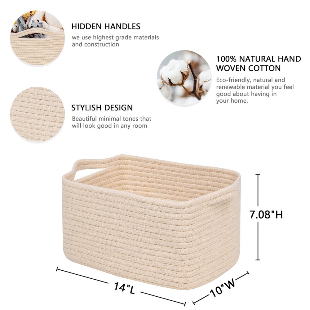 Upgrade Everyday Living with CubesLands' small Cotton Rope Baskets: Perfect for Chic Organization Throughout Your Home! CubesLands’ modern cotton rope storage basket - designed to bring order and beauty wherever you place them. The stylish organizers are your go-to for banishing clutter with a touch of flair. Whether it's your nursery, bathroom or office, the storage baskets for shelves & more make it a joy to find a place for everything, effortlessly turning chaos into organized bliss. Brighten up your decoration effortlessly with the beautiful cotton rope baskets. Their stylish colors complements any interior, from modern living rooms to cozy nurseries. Use them as bathroom storage bins, as a changing table organizer, for neat nursery organization or to tidy up your office and home-schooling essentials. Sizes: 14x10x7.08". The lightweight and sturdy organizing baskets are super practical and also a chic eye-catcher. Whether you're arranging toys in the nursery, tidying your desk, or organizing toiletries in the bathroom, the basket set effortlessly integrates into your daily routine. Rectangular Basket. The size of woven rope basket is 14 x 10 x 7.08Inches. Great storage solutions for your laundry room, closet, shelves, entryway, playroom and so on. It also can be used for nursery room as baby baskets or small toy baskets, making your home clean and tidy Soft Cotton Material: The shelves organizer baskets is made of cotton rope. Our rope basket soft yet sturdy enough to stand up on their own Handle Design: The woven basket is designed with handle, making it convenient for you to pull out the basket bins from the shelves or cube shelf Home Decor Basket:Chic, neutral colors complement any decor style Excellent empty gift basket: Our small baskets with sturdy handles are softly textured. This basket is perfect for all kinds of gift storage, for example, You can use it as a baby gift basket,birthday gift basket,Easter and Christmas gift basket ,house warming gifts basket