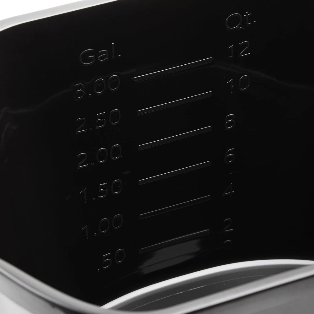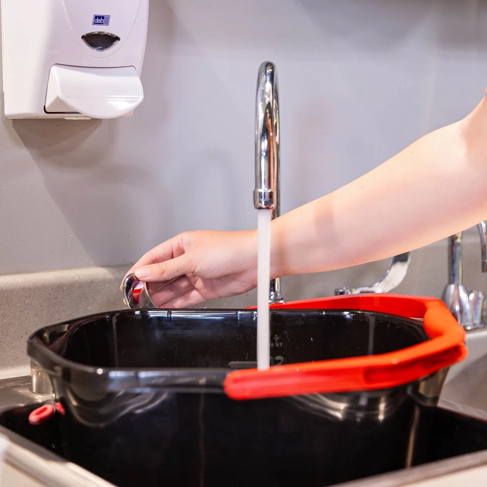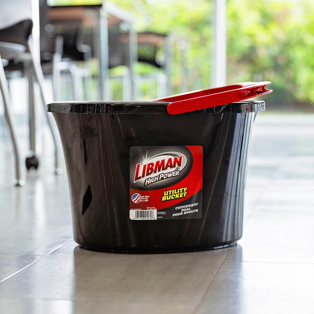 Libman High Power utility bucket with red handle. Made of polypropylene for superior resistance to cleaning chemicals. Bucket has dual pour spouts to help ensure no spillage when pouring from either side. Fluid measurements molded inside the bucket for precise mixing of cleaning chemicals. Measurements: 10.25” tall with a width of 16” and depth of 10”. Molded in black to hide any stains or discolor due to harsh cleaning chemicals. Comfortable ergonomic handle that protects the users’ hands when bucket carrying. 3.5 gallon capacity. Solid Polypropylene one piece molded bucket with handle Capacity of 3.5 gallons, 13.25 liters, 448 ounces Comfortable ergonomic handle for ease of carrying even with a full bucket Fits all standard sponge and wet mops with a 15.5 inch by 9.5 inch opening and total dimensions of 10.94 inches by 11.56 inches by 15.81 inches Also can be used to carry household tools like sponges and rags Heavy duty 12 melt polypropylene construction for both the bucket and the handle.