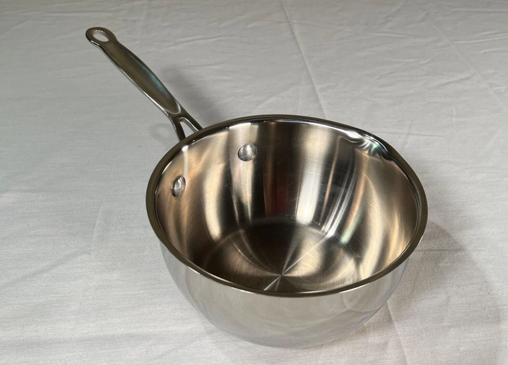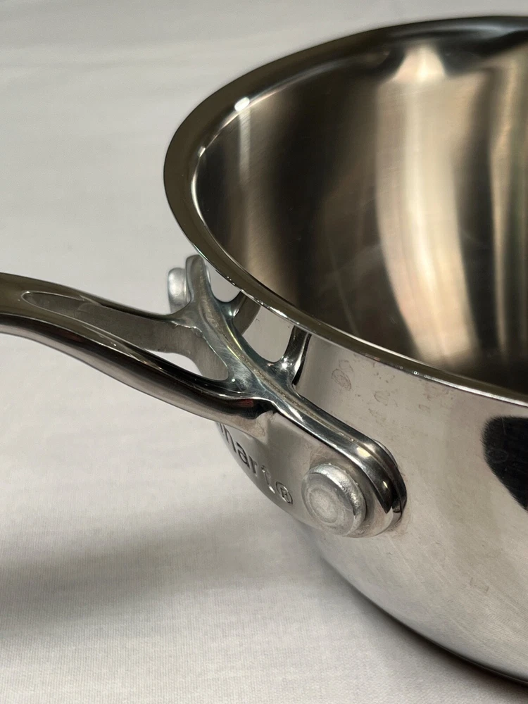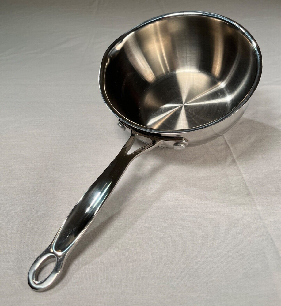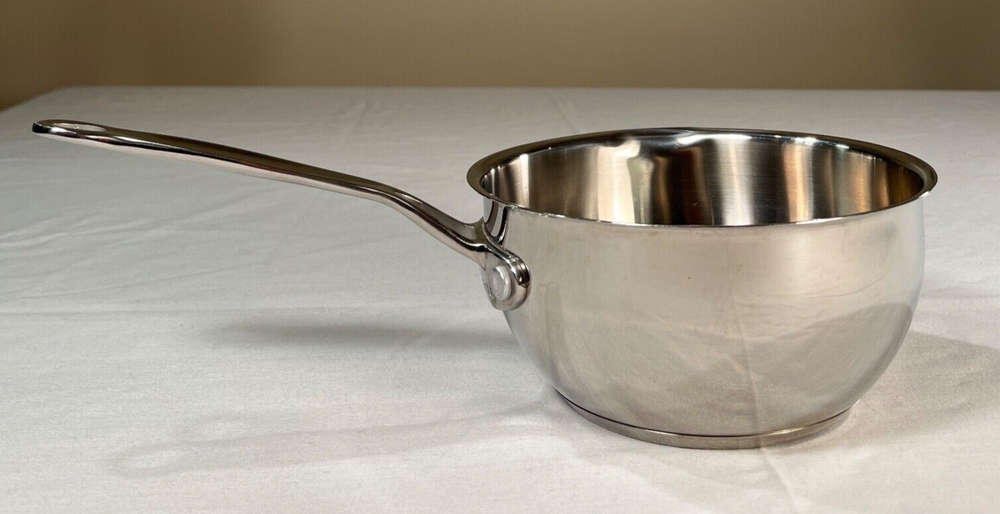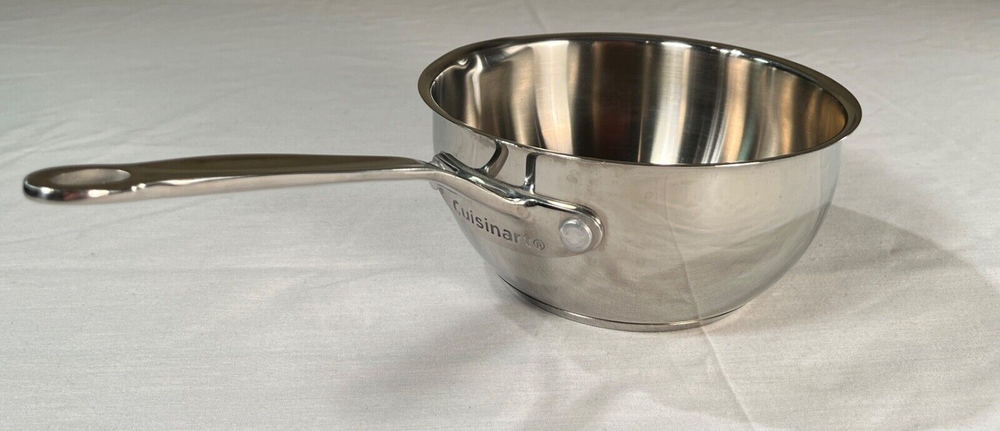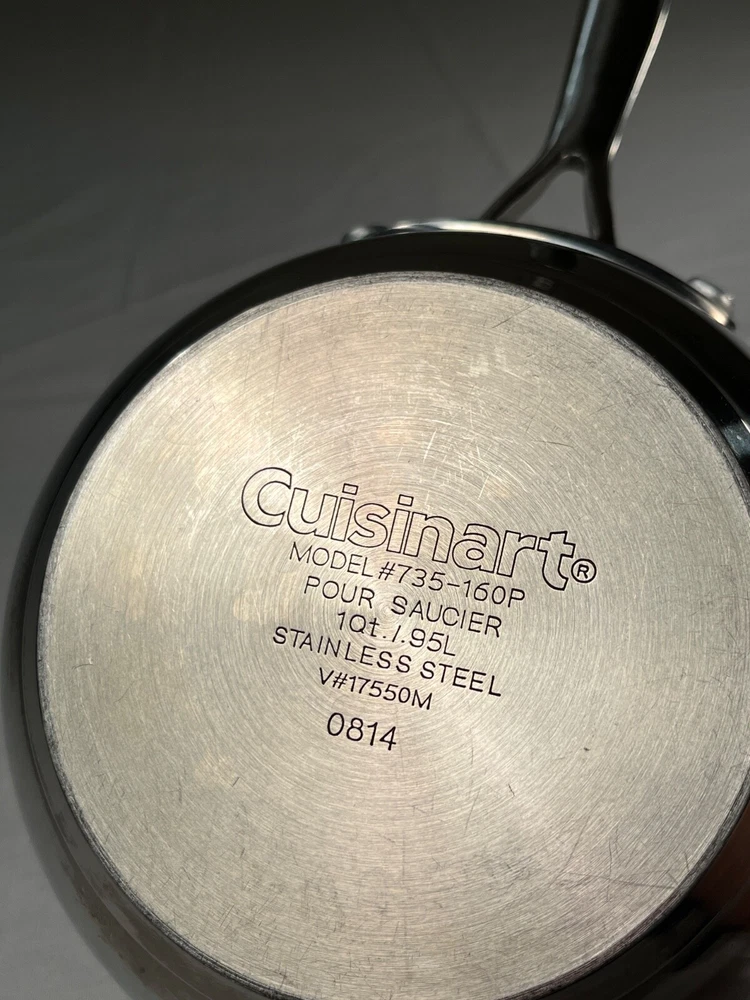 Cuisinart Pour Saucier Model #735-160P, 1 Qt / .95 L Stainless Steel Pot / Pan. This sauce pain is in good condition with minimal wear. Please review the pictures because they provide most of the description and information about condition. Additional information on underside of pan reads: V#17550M 0814 Dimensions: Length: 13 in, including to tip of handle Diameter across the top: 6 3/4 in Diameter across the base: 4 in Height from base to top of pan: 3 1/8 in Height from base to top of tip of handle: 4 1/4 in Weight: 17.8 oz (1.1 lb) No lid included.
