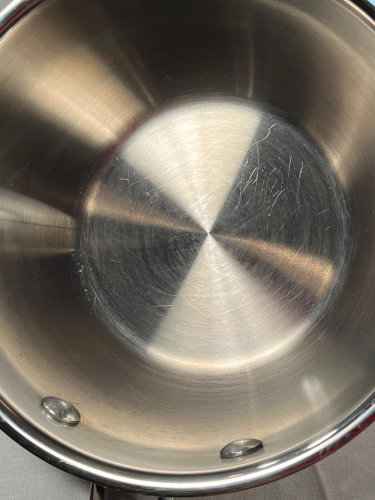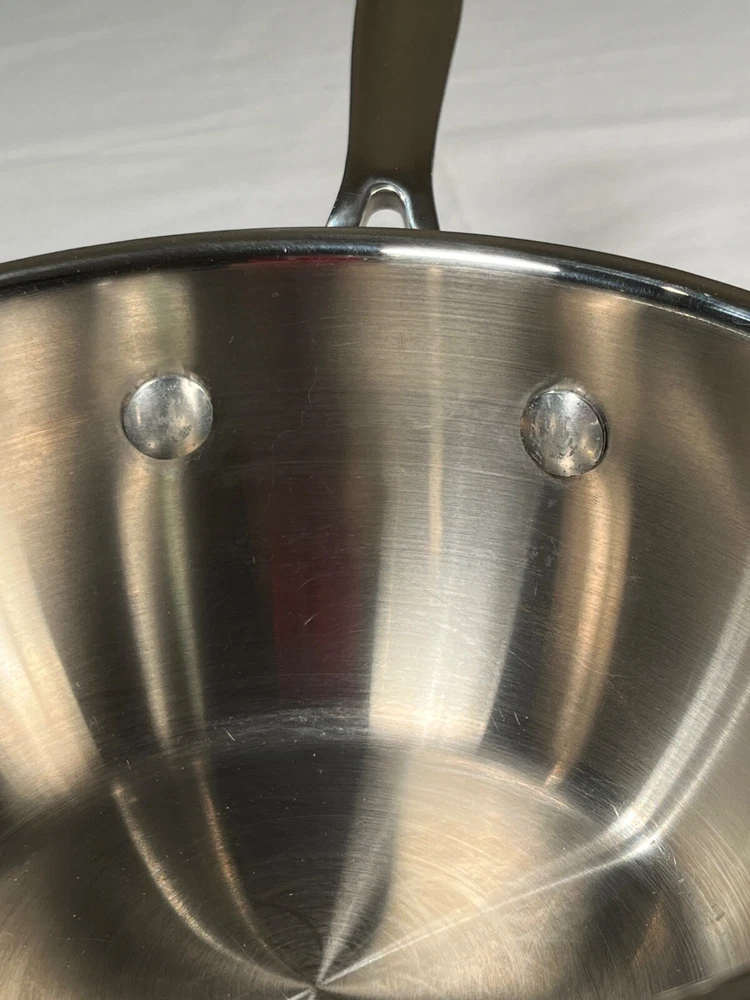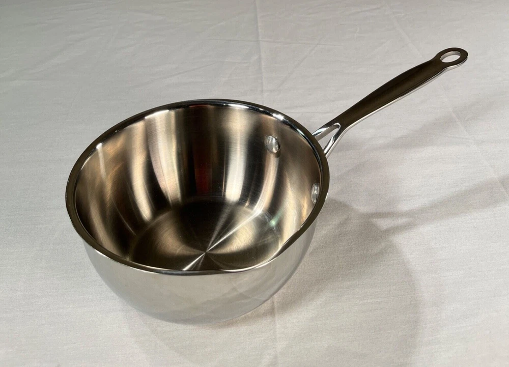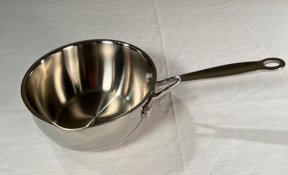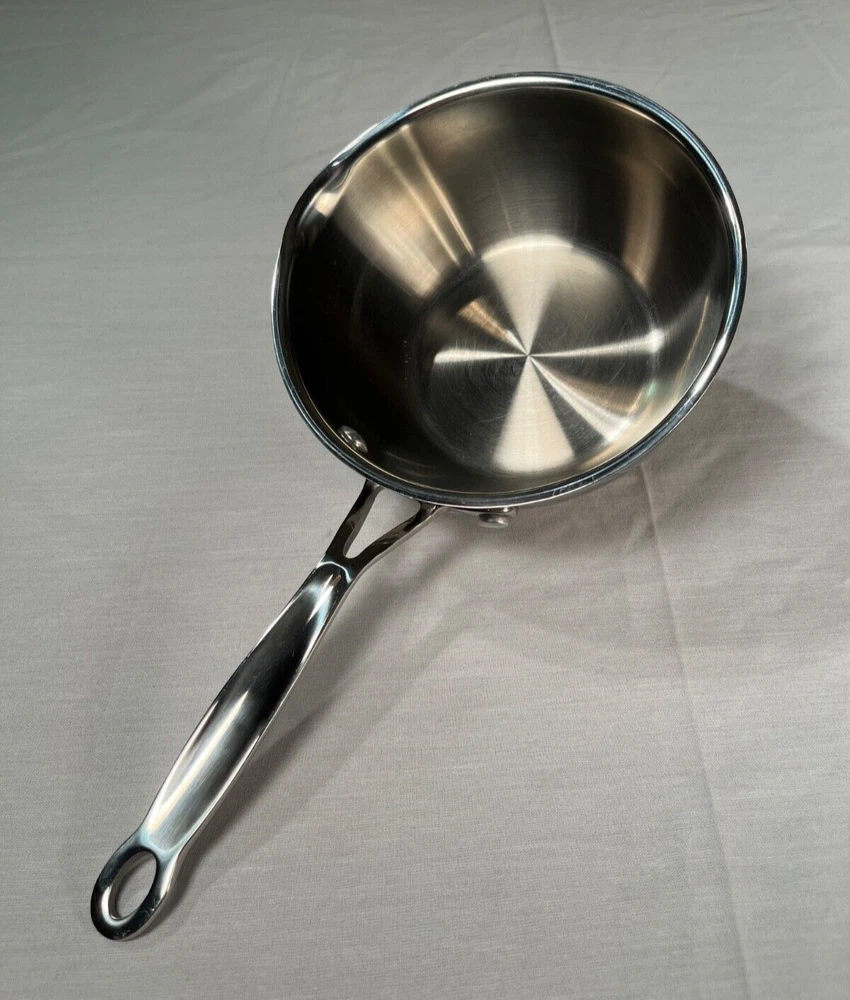 Cuisinart Pour Saucier Model #735-160P, 1 Qt / .95 L Stainless Steel Pot / Pan. This sauce pain is in good condition with minimal wear. Please review the pictures because they provide most of the description and information about condition. Additional information on underside of pan reads: V#17550M 0814 Dimensions: Length: 13 in, including to tip of handle Diameter across the top: 6 3/4 in Diameter across the base: 4 in Height from base to top of pan: 3 1/8 in Height from base to top of tip of handle: 4 1/4 in Weight: 17.8 oz (1.1 lb) No lid included.