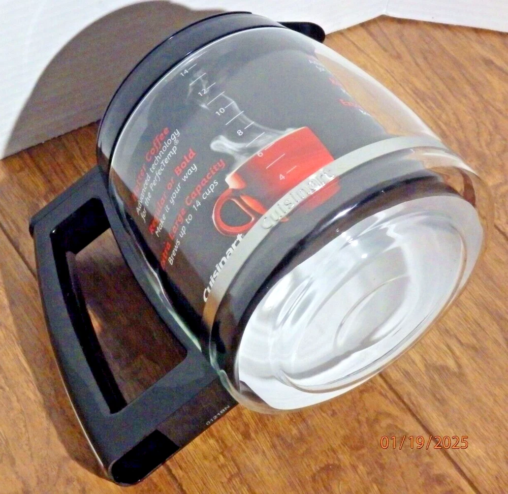 The Cuisinart Coffee Pot Replacement Glass Carafe is designed to hold 14 cups of coffee and comes with a black lid. It is compatible with Cuisinart coffee makers and is a genuine Cuisinart product. The carafe is brand new and does not come in its original packaging. This replacement carafe is perfect for those in need of a new glass carafe for their Cuisinart coffee maker, ensuring they can continue to enjoy freshly brewed coffee at home. The item is in new condition as pictured. I offer fast shipping with prompt payment. Please check out my page for other great items and collectibles!!