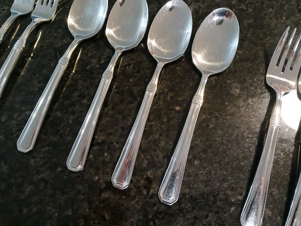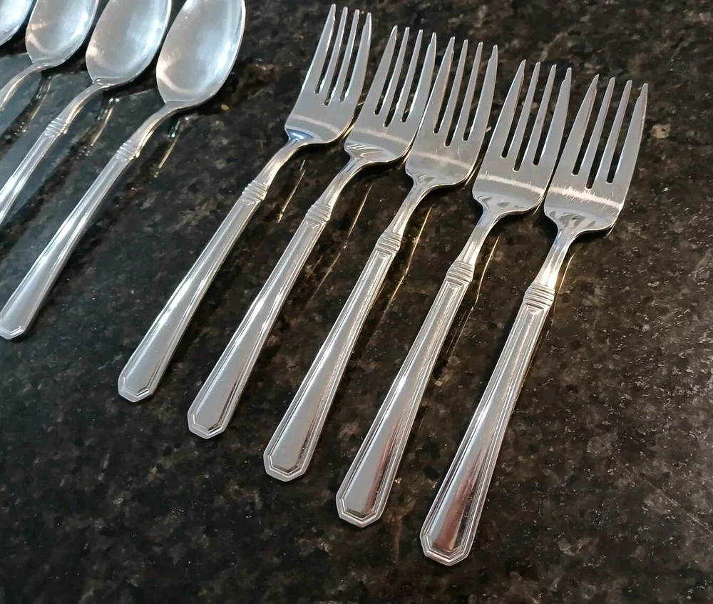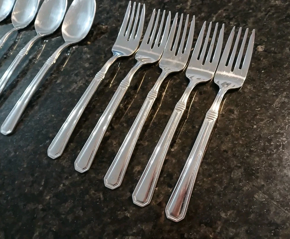 The product is a Cuisinart Stainless Flatware 15 Piece Set including forks, knives, and spoons. It features a glossy finish and is made of stainless steel. The set includes a fork, knife, and spoon with a stylish pattern design on the handles.