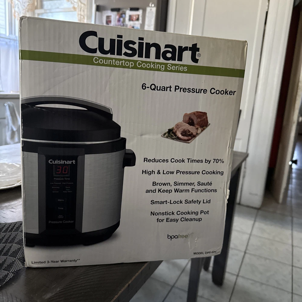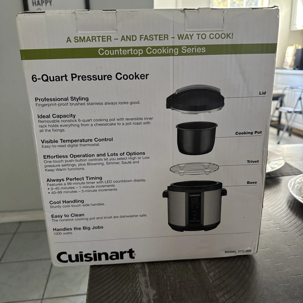 Experience the convenience of meal preparation with the Cuisinart CPC-600 Electric Pressure Cooker. With a 6-quart capacity and 1000-watt power, this multi-cooker is a great addition to any kitchen. Its stainless steel construction ensures durability while the brushed finish adds a touch of elegance. The cooker comes with a variety of features including a non-stick, dishwasher-safe cooking pot, a drip tray, and a display that allows for easy programming and monitoring. It has five settings/programs, a maximum timer setting of 99 minutes, and is programmable for automatic cooking. The portable design makes it perfect for any kitchen space.