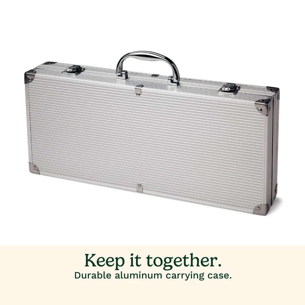 Elevate your grilling game with the Cuisinart 20-Piece Deluxe Grill Tool Set, a complete collection of BBQ essentials in one convenient kit. Crafted from stainless steel, this set offers professional-grade tools, including everything from a chef’s spatula and grill tongs to a high-performance grill cleaner brush and a digital temperature fork with LED light and alarm settings. Perfect for home barbecues, camping cookouts, or tailgates, the tools come packed in a sleek, durable aluminum carrying case, ensuring you have top-tier grill accessories wherever you go. Whether you're a seasoned chef or a weekend griller, this set equips you with all you need for flavorful, perfectly grilled food. Features COMPLETE 20-PIECE BBQ TOOL SET: Includes chef’s spatula, grill tongs, digital temperature fork, silicone basting brush, four pairs of corn holders, five skewers, a cleaning brush with an extra brush head, and more—all neatly organized in a stylish, sturdy aluminum case. Perfect for storage and portability. CHEF’S SPATULA & GRILL TONGS: The multi-functional spatula has a perforated surface for flipping, a serrated edge for cutting, and a built-in bottle opener for convenience. Durable stainless-steel tongs are designed for easily grabbing, flipping, and serving food with precision and ease. DIGITAL TEMPERATURE FORK: Ensures perfect results with preset temperature alerts, an LED light for night grilling, and an alarm to prevent overcooking. Say goodbye to guesswork! ALUMINUM CARRYING CASE: Our sturdy, stylish and compact aluminum carrying case perfect for easy transport and organized storage of all your grilling essentials. 18.5" GRILL BRUSH: The 18.5-inch-long brush with 14 square inches of stainless-steel bristles allows you to clean your grill faster with less passes and less fatigue!