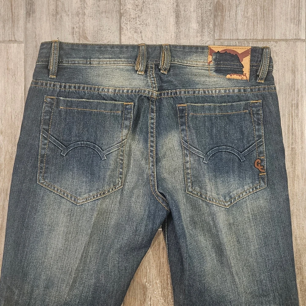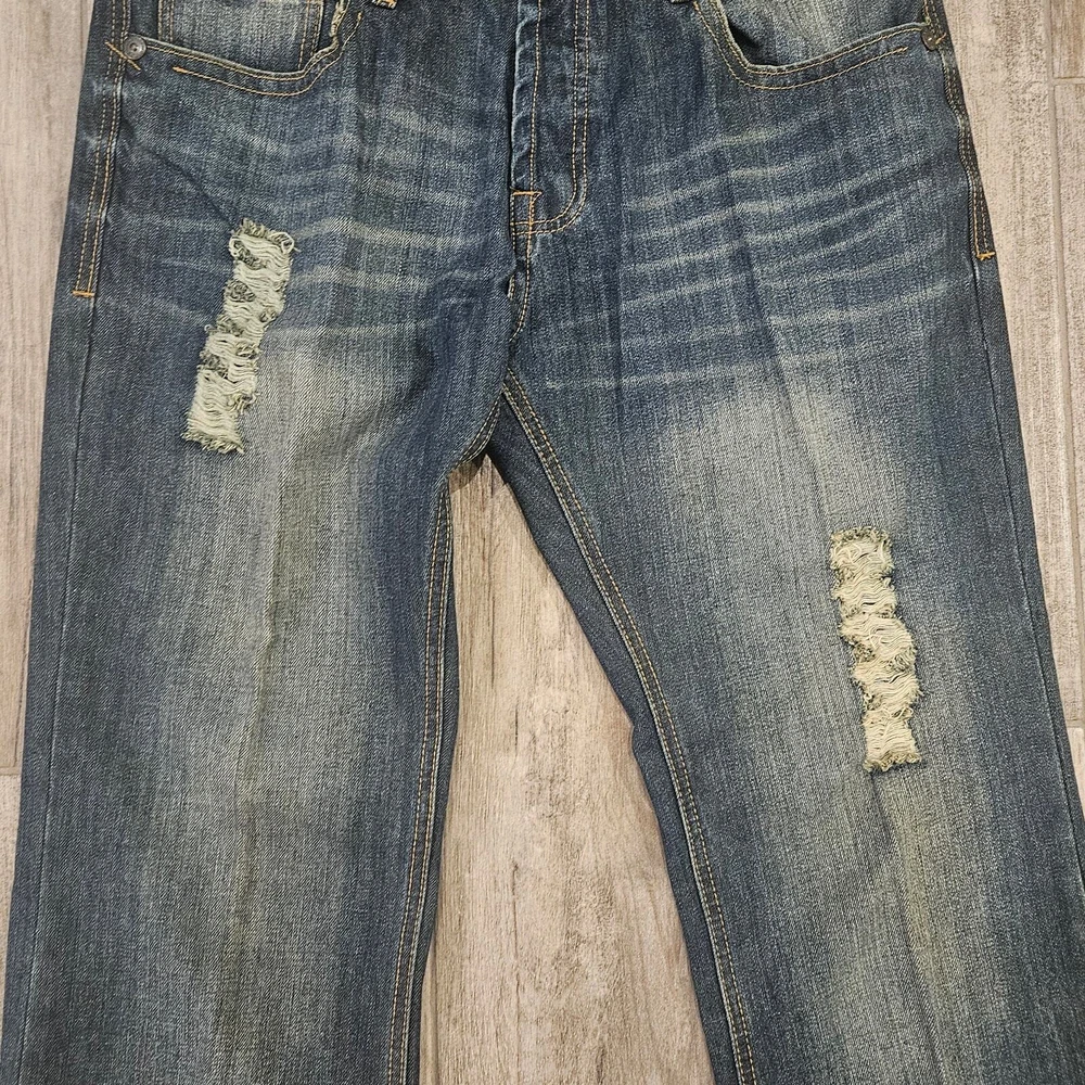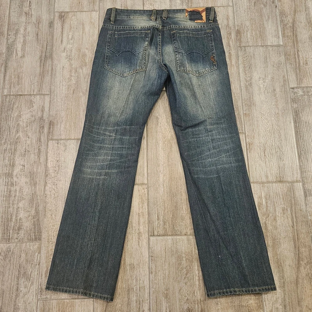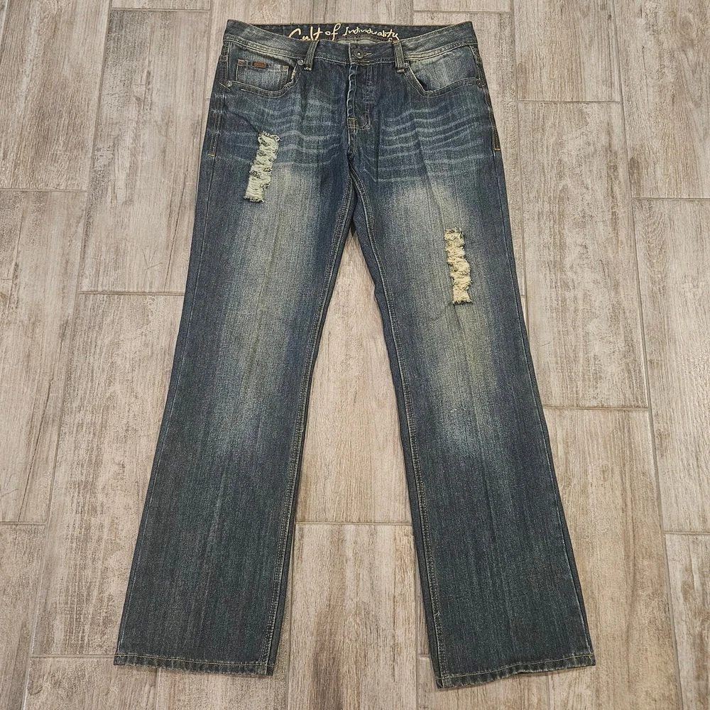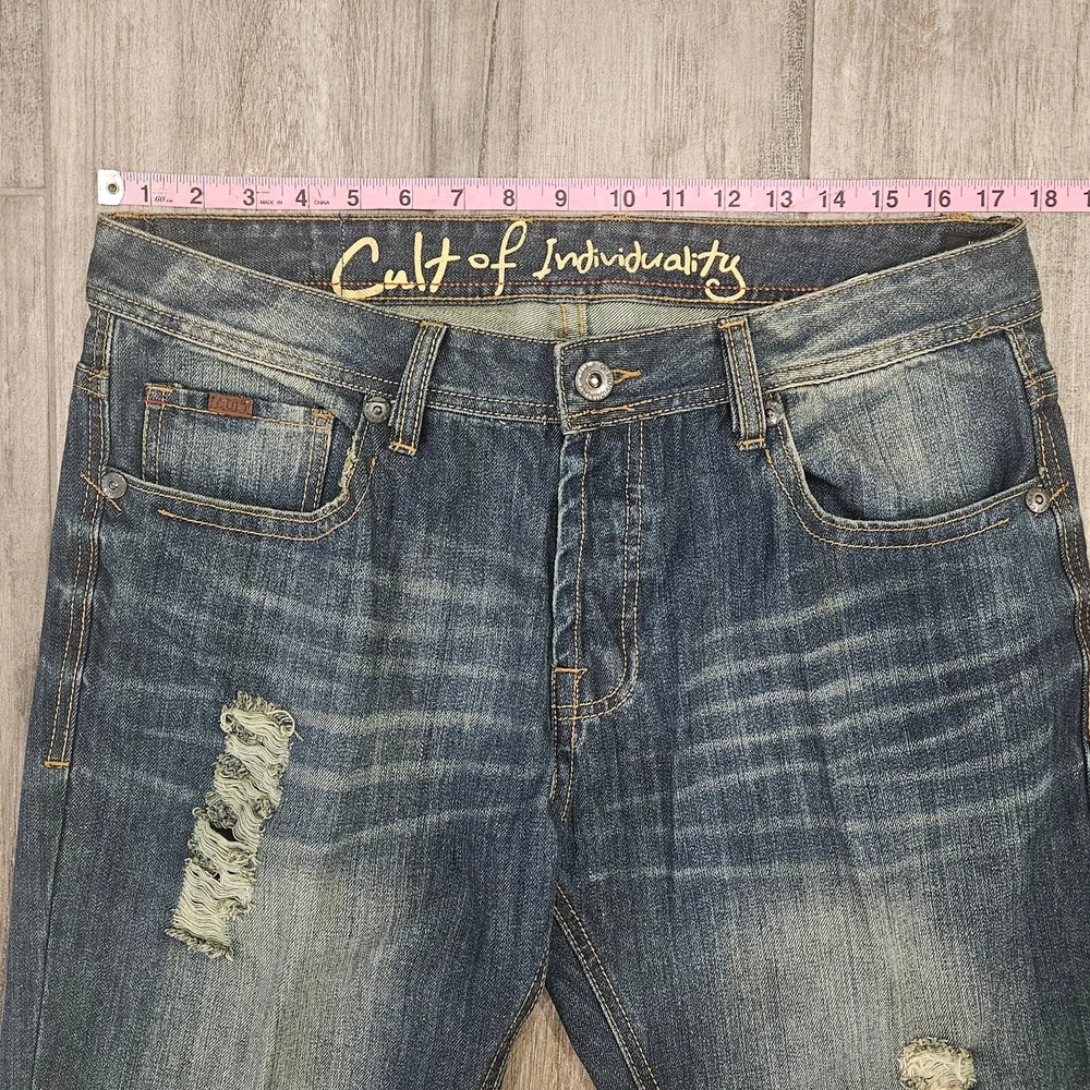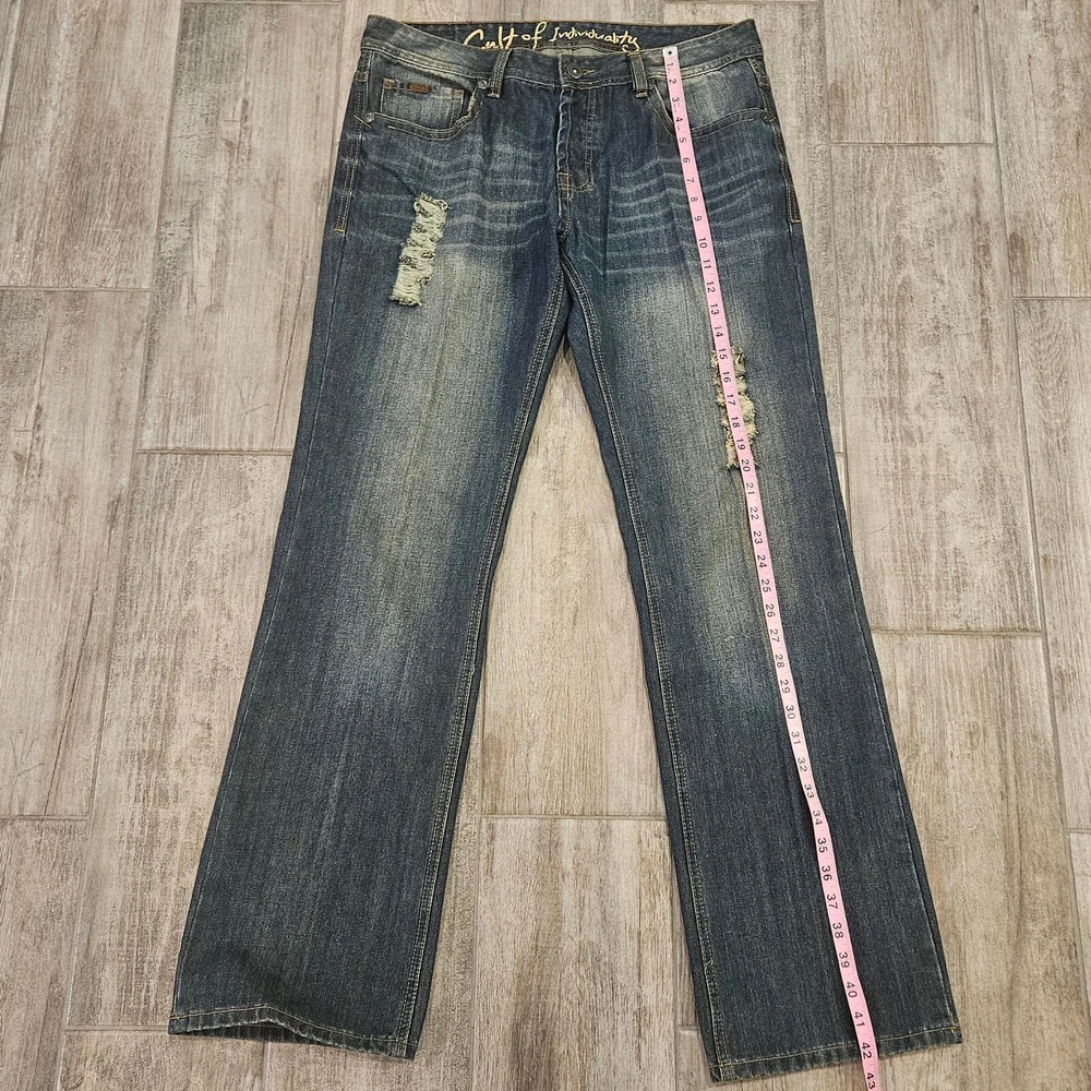 Cult Of Individuality Jeans Size 36x34 Hagen Straight Leg Dark Wash Distressed Measurements are included in the photos Elevate your casual style with these Cult of Individuality Hagen Relaxed fit jeans in a dark wash. Made from 100% cotton denim fabric, these straight leg jeans feature a 5-pocket design and a button-fly closure with belt loops. The jeans have whiskering, fading, and distressed accents for a look that adds character to your outfit. They are easy to care for, machine washable, and suitable for all seasons. The jeans are designed in Los Angeles, California, and have a USA streetwear theme. Excellent Pre Owned Condition Bundle for a discount or send an offer