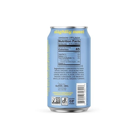 Description Enjoy a refreshing twist on soda with Culture Pop Ginger Lemon & Turmeric Probiotic Soda ! This fizzy, flavorful beverage blends bold ginger and zesty lemon with a hint of earthy turmeric. Packed with live probiotics for gut health, it’s a great-tasting, low-sugar alternative to traditional sodas. Made with clean, non-GMO ingredients, Culture Pop is gluten-free, kosher, and contains no stevia or artificial sweeteners. Perfect for those who want a functional, delicious drink without the junk. Features Flavor : Ginger, Lemon & Turmeric Probiotic : Contains live probiotics for gut health Low Sugar : Only 5g sugar per can – no stevia or artificial sweeteners Clean Ingredients : Non-GMO, kosher, and gluten-free Sparkling Juice Alternative : A flavorful, fizzy drink without the guilt 12-Pack : Includes twelve 12 fl oz (355ml) cans Shelf-Stable : No refrigeration required until opened