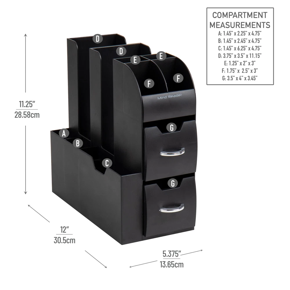 Streamline Your Breakroom with an All-in-One Organizer Efficiently organize your breakroom essentials with this versatile all-in-one organizer. With eleven compartments, this organizer provides ample storage space for coffee, tea, condiments, and more. Whether it's for college dorms, breakrooms, offices, hotels, or other spaces, this durable organizer is designed to withstand high traffic areas such as hotel lobbies or office breakrooms. No assembly is required, making it convenient to use right out of the box. Simply place this organizer in your kitchen, office, or cabinets to keep small kitchen or bathroom items neatly stored and easily accessible. The 11-compartment organizer features three tiers and two drawers, offering efficient storage for all your condiments. It's not limited to coffee and tea supplies, as it can also be used to organize makeup and toiletries in the bathroom. To clean the organizer, simply wipe it with a cleaner or dish soap and water. The spacious 3.75-inch (9.5 cm) opening accommodates 12-, 16-, and 20-ounce cups and lids, allowing for convenient stacking. The compartments are designed to hold utensils, napkins, single-serve coffee pods, creamers, tea bags, salt and pepper packets, as well as snack bars and chocolates. The organizer features a sleek black color that blends well with any decor, and its chrome-look handles add a touch of modernity to your home, office, or hospitality setting. Cleaning the organizer is a breeze thanks to its durable and food-safe plastic construction, ensuring it remains hygienic between uses. Streamline your breakroom and create a tidy and organized space with this practical and versatile all-in-one organizer. Efficient organization for coffee and tea enthusiasts: This compact coffee and tea organizer, measuring 5.35 inches wide, maximizes space while providing a convenient storage solution for your coffee, tea, and related condiments. Whether it's on a hotel buffet or your kitchen counter, you can keep everything neatly organized without sacrificing valuable space Built to last: Crafted from durable, food-safe plastic, this organizer is designed for everyday use in hotels, cafes, offices, or your own kitchen. Its sturdy construction ensures long-lasting durability, even with frequent handling and use Secure and stable: With bottom rubber grippers, this organizer stays securely in place on your countertop or table, preventing any unwanted sliding or slipping. You can rely on it to stay put and keep your items organized and easily accessible Versatile functionality: While ideal for coffee and tea essentials, this caddy's multiple compartments and drawers offer flexibility for organizing other items as well. Use it to store office and school supplies, makeup, or any small accessories that need a designated spot Optimal size for small spaces: Measuring 11.25 inches long x 5.35 inches wide x 11.15 inches tall (28.58 x 13.6 x 28.3 centimeters), this space-saving caddy fits perfectly in compact areas, freeing up valuable counter space for other purposes. Enjoy a clutter-free and organized environment without compromising functionality