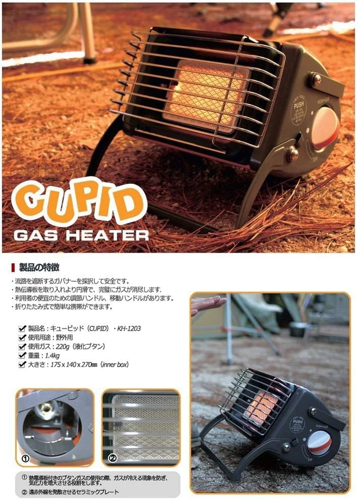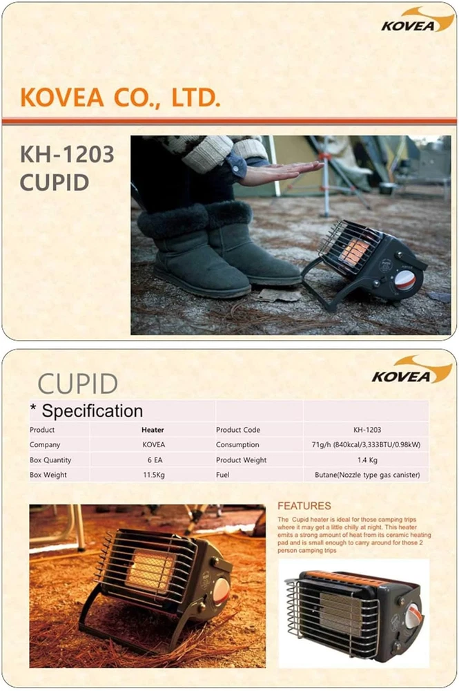 Fuel: Butane (Nozzle type gas canister) Includes hard carry case Folding legs to provide stable base Ceramic based heating plate Fuel canister not included Kovea Cupid Space heater. Uses butane as a fuel, includes a carry case. Has an Auto shut off mechanism,