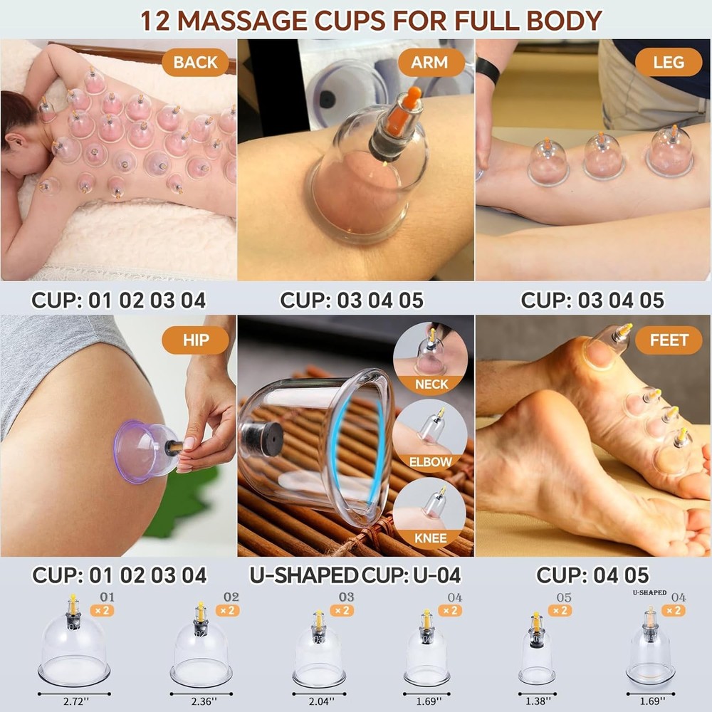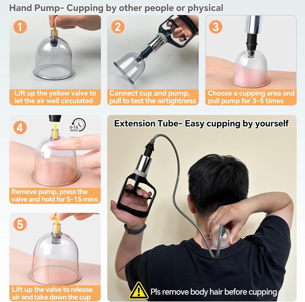 Cupping Therapy Massage Kit w Pump 12 Cups for Cellulite Muscle Product Dimensions 0.2 x 0.2 x 0.2 inches; 15.84 ounces Item model number 12 CUPS BLACK HAND PUMP Manufacturer AIKOTOO Brand AIKOTOO Use for Arm, Back, Body, Feet Material Polycarbonate Color Black Hand Pump Features New Safer Cupping Set- Cupping is an ancient Chinese and Egyptian method of massage. Unlike traditional cupping therapy set, our cupping set uses pc material cups that are engineered with high grade plastic to provide superior suction & control. Our massage cups are anti-crack and resistant to drops with good heat resistance and high toughness. How To Use&Remove- 1. Connect the cup with hand pump. 2. Place the cup on skin and pull the pump for 3-5 times. 3. Remove the pump and press down the orange valve to avoid air leaking, holding for 5-15 mins. 4. Lift up the orange valve to release air and take off the cup. Important Note: before cupping, please lift up the ORANGE VALVE to ensure the airflow inside the cup is good. Aikotoo Hijama Cupping Set Includes- 12 cups set with 6 different sizes of cups: 2 cups OD 2.72", 2 cups OD 2.36", 2 cups OD 2.04", 2cup OD 1.69", 2 cups OD 1.38" for wide body parts such as back, waist, thighs and more. 2 curve cup OD 1.69" for curved parts such as neck, elbow, knee and other joints. Pls use curve cup only on joints or curved parts of body. Multi-functional Cupping Massager- The cupping device comes with a Gua Sha scraping tool, combines cupping,guasha and flameless massage in one.We offer a 26.7-inch extension tube to help your do the cupping yourself and a ABS plastic Hand Pump to adjust the suction level. Simply apply the cups on back,neck,arms or legs to enjoy an ultimate cupping massage at home or on-the-go. Benefits of Using Cupping Therapy Sets- Cupping sets are used for back, neck, shoulder, waist and leg pain relif by placing cups on your body, which helps loosen muscles, increase circulation, remove tension, relieve stress, improve sleep quality, sedate the nervous system, relax body and much more. Our Business 100% Customer Satisfaction We go above and beyond to ensure you receive the best level of service. Returns We want you to be happy with your purchase, however in the rare occasion that you are not, please let us know and we will contact you to arrange either a collection or a refund. Please CONTACT US before leaving any negative feedback and we will promptly sort out any issue with your order. 7967568