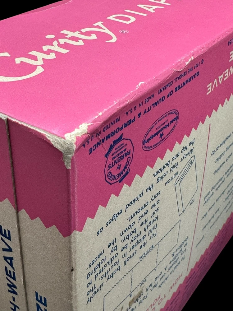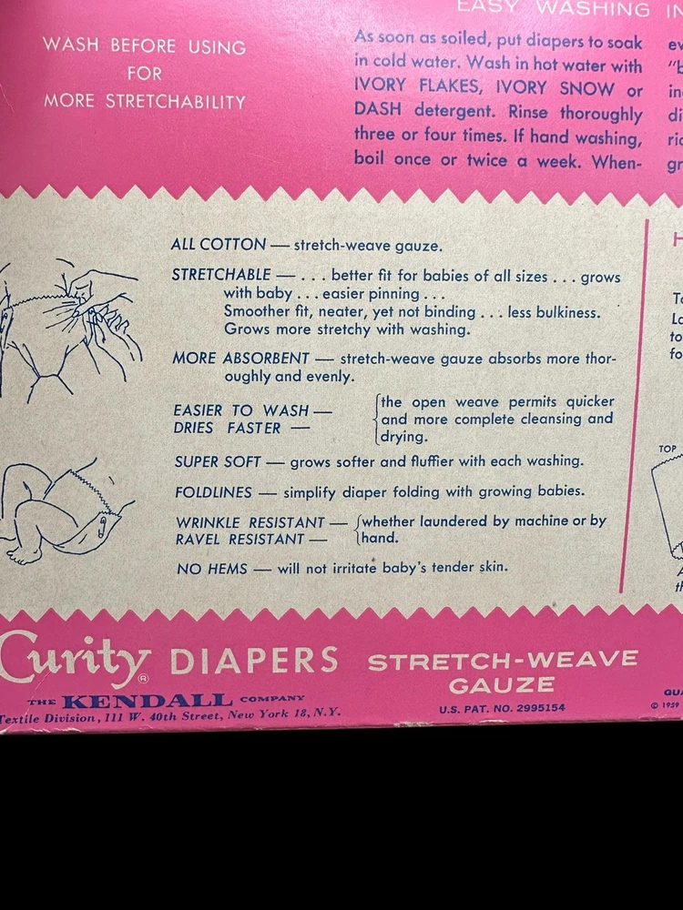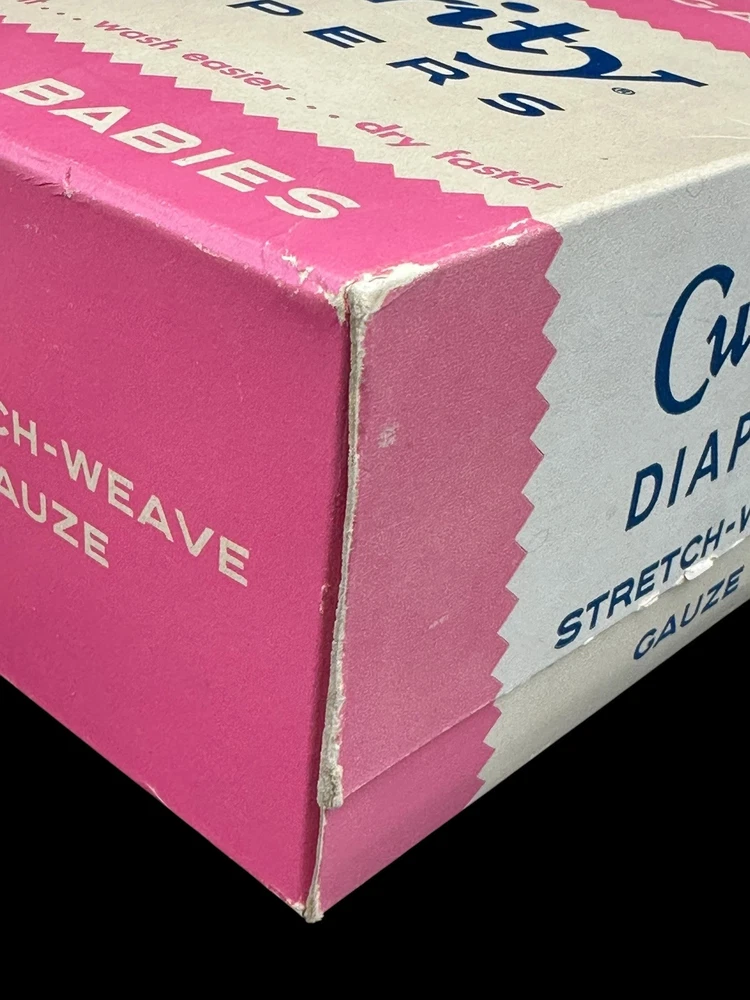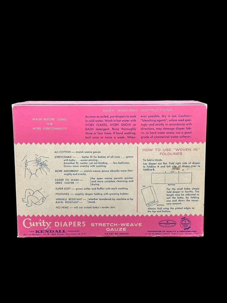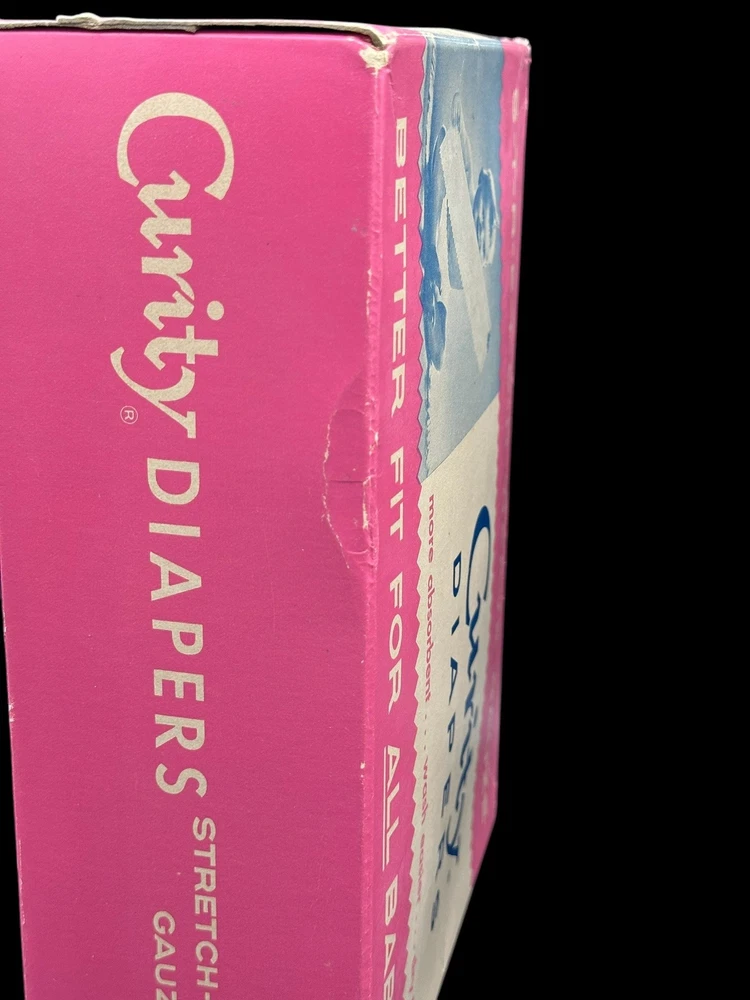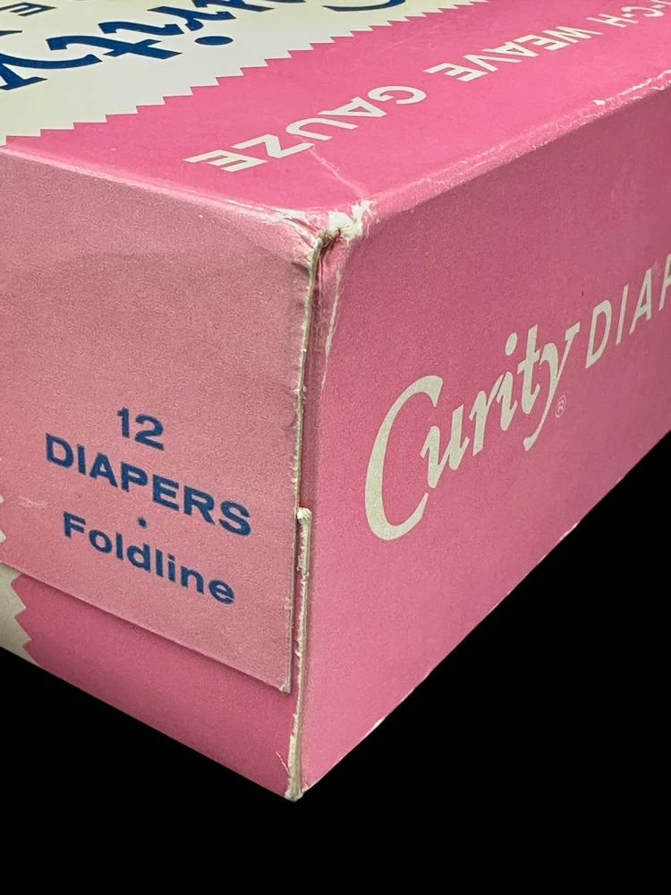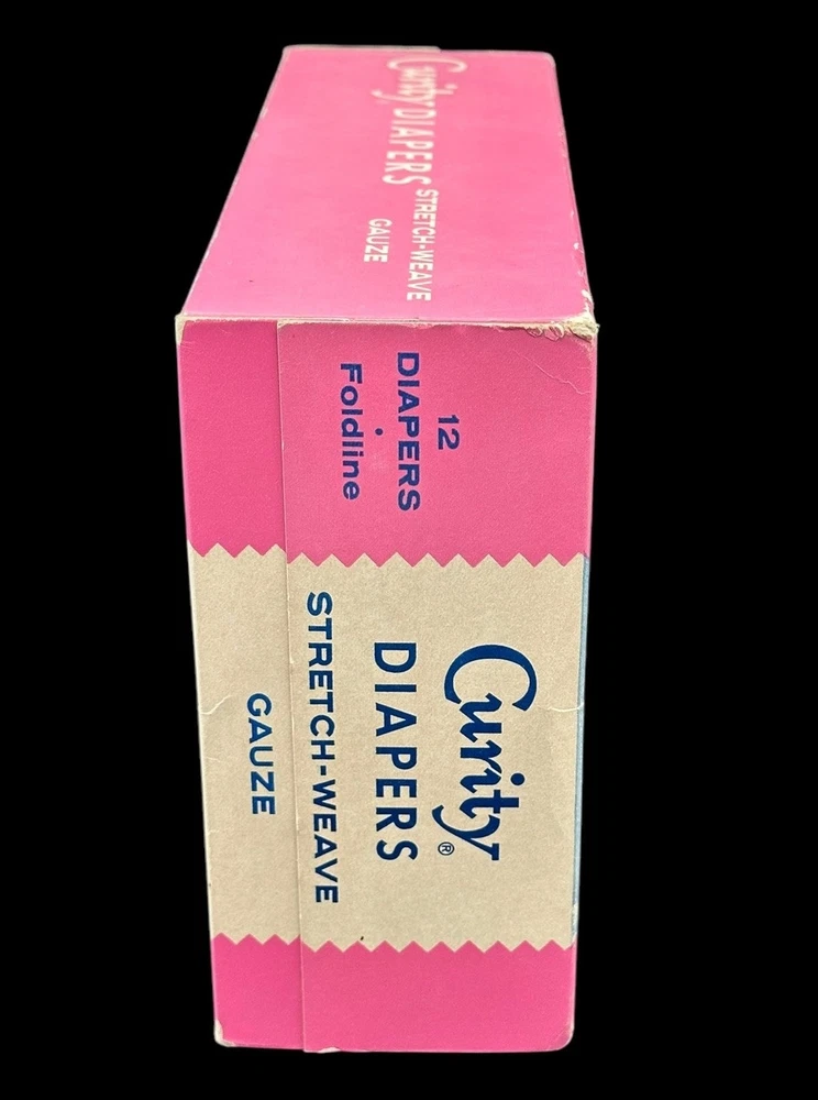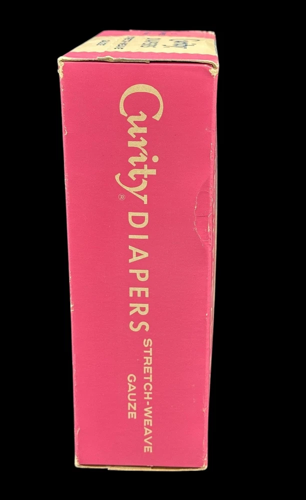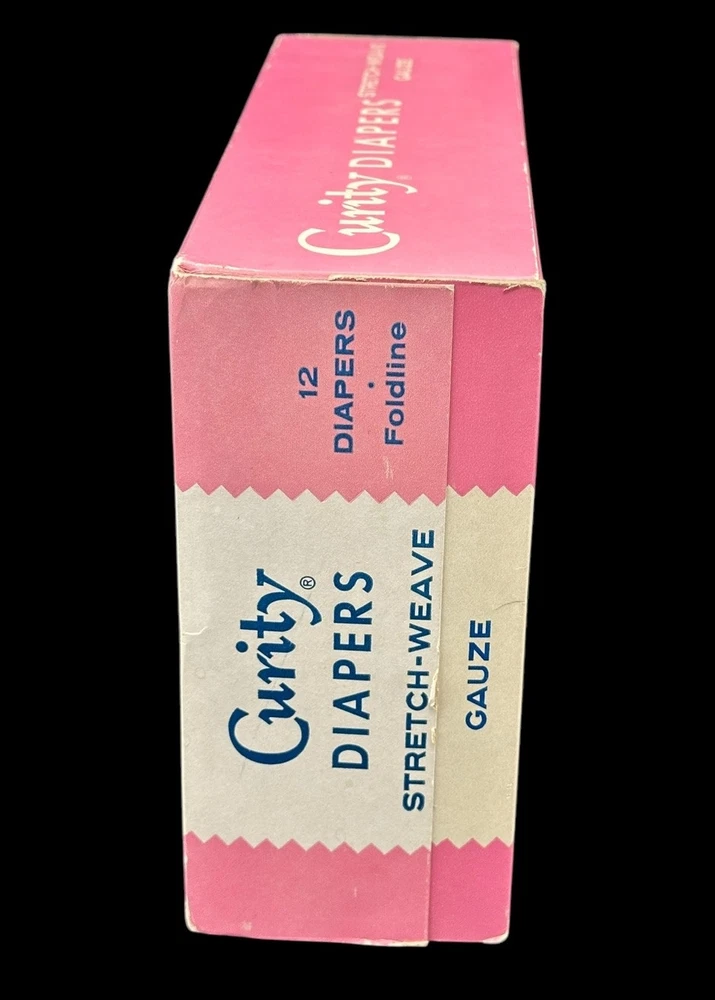 Curity Diapers Stretch Weave Gauze Cotton 12 Pack 1959 Vintage Original Box These are old. Never opened. Set of 12. Manufactured in 1959. Box is sturdy, but not perfect. There is wear. There are dents. There is spot of something that’s stuck to the back. See pics.