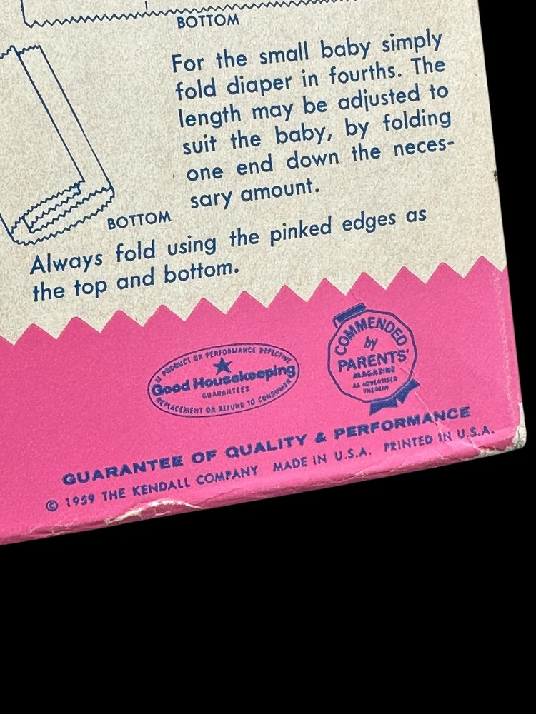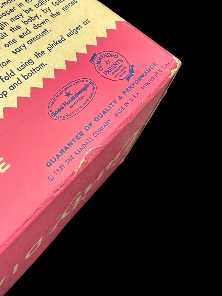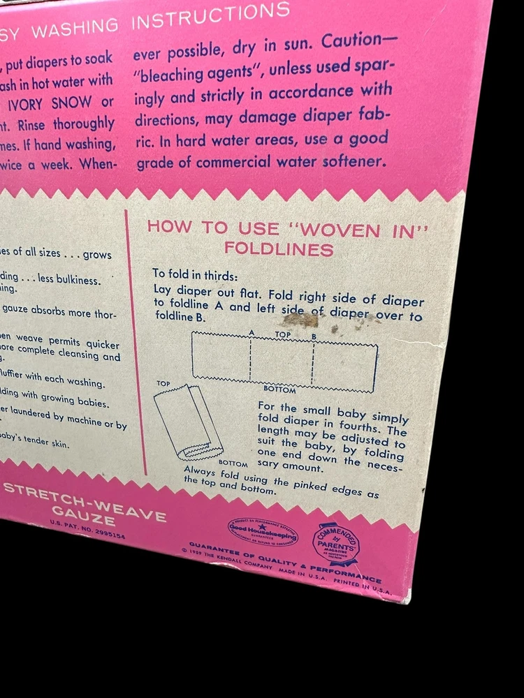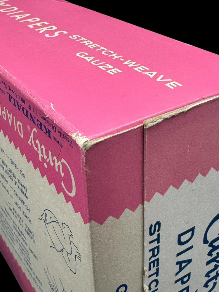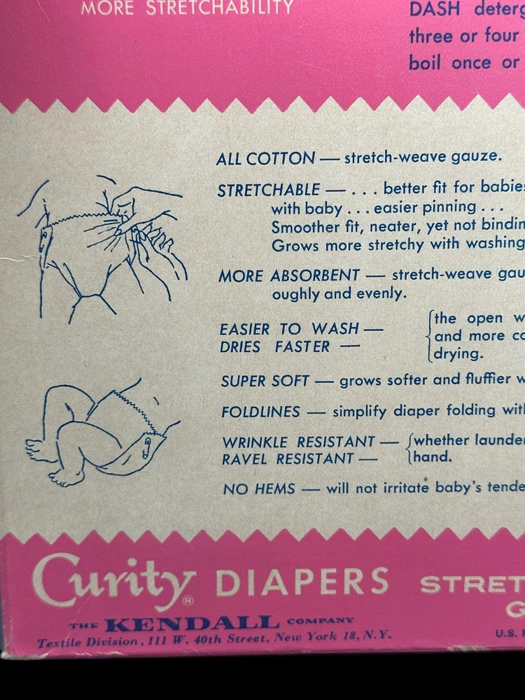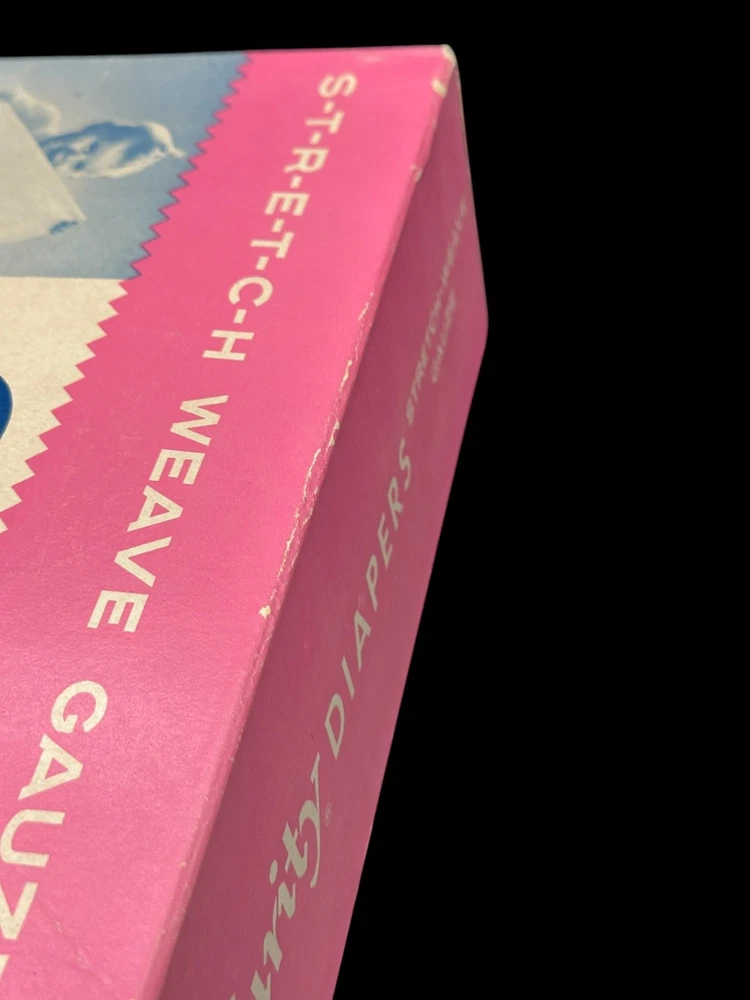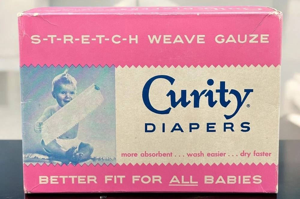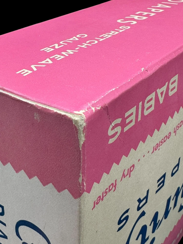 Curity Diapers Stretch Weave Gauze Cotton 12 Pack 1959 Vintage Original Box These are old. Never opened. Set of 12. Manufactured in 1959. Box is sturdy, but not perfect. There is wear. There are dents. There is spot of something that’s stuck to the back. See pics.