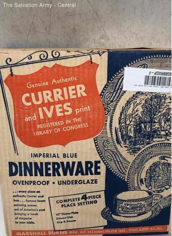 Title : Currier & Ives Imperial Blue The Old Grist Mill Dish Set 4 Piece Place Setting Shape : Round Condition: Good - shows some signs Material: Ceramic Brand: Currier & Ives Color: White Blue All net proceeds will support The Salvation Army - Adult Rehabilitation Centers. Thank you for your support! Customer Service Hours: Monday - Friday 8:00am - 4:00pm EST Updated Shipping Policy Starting April 1, 2023 Flat-rate Shipping Service To be eligible for combined shipping, all invoiced items must fall under our flat-rate shipping policy. When orders are combined under the flat-rate shipping policy, larger items will be charged $14.99 for the first item and an additional $6 shipping fee per additional item. Smaller items will be charged $9.99 for the first item a $1 shipping fee will be charged per additional item. Requests for combined shipments must contain less than 20 items per shipment and cannot include items that are sold with calculated shipping. These items include large or bulky items, instruments, artwork, or framed items. Calculated Shipping Service Please note that items that are sold with calculated shipping cannot be combined with other items in the same shipment. This is because these items may include large or bulky items, instruments, artwork, or framed items, which require separate shipping arrangements. Thank you for your understanding.