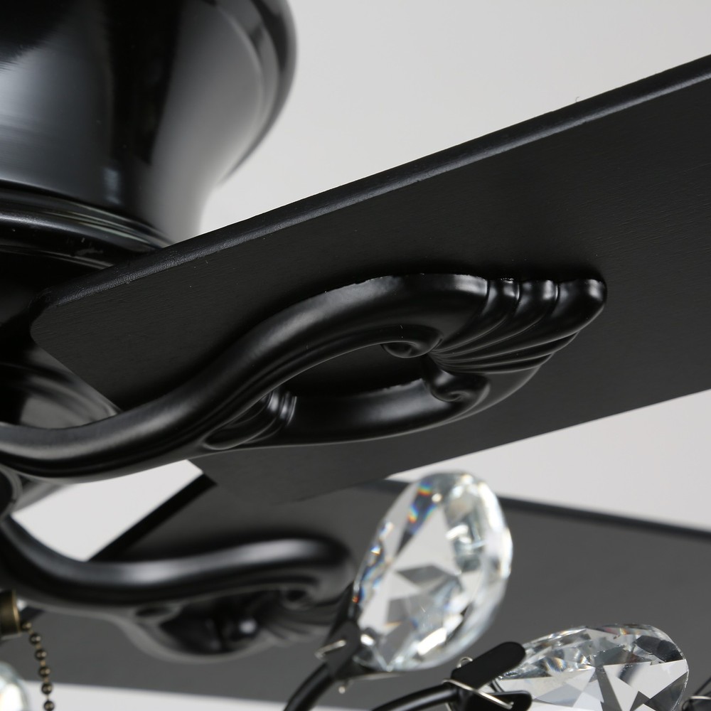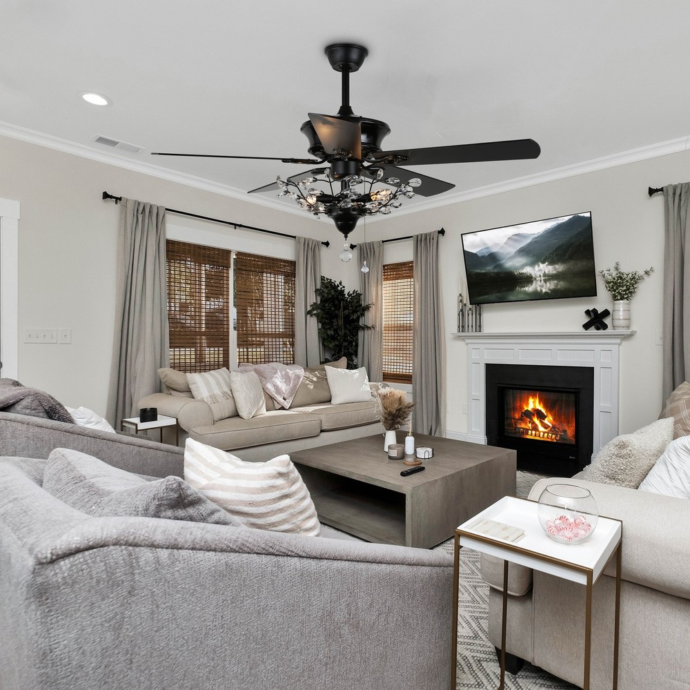 Upgrade your space with our classic ceiling fan, combining timeless design and modern functionality. This fan features a branch-shaped light fixture that adds a unique touch to any room while providing ample illumination, Its sleek and versatile design effortlessly complements a variety of interior styles. With both remote and pull chain control options, adjusting the fan speed and light settings is a breeze. The fan is perfect for bedrooms, living rooms, or any space where both cooling and lighting are essential. Features: Classic fan design with modern light shade, making this ceiling fan perfect for classic and modern décor. Remote and pull chain control included 3*E12 base provided(blubs not included) 2 sizes of down rods included, suitable for low or high ceilings Sloped Free Shipping Over $49.99* Details CurveCurio 52-In Classic Ceiling Fan with Light, Brach Shaped Light Shade, Product Description: Upgrade your space with our classic ceiling fan, combining timeless design and modern functionality. This fan features a branch-shaped light fixture that adds a unique touch to any room while providing ample illumination, Its sleek and versatile design effortlessly complements a variety of interior styles. With both remote and pull chain control options, adjusting the fan speed and light settings is a breeze. The fan is perfect for bedrooms, living rooms, or any space where both cooling and lighting are essential. Features: Classic fan design with modern light shade, making this ceiling fan perfect for classic and modern décor. Remote and pull chain control included 3*E12 base provided(blubs not included) 2 sizes of down rods included, suitable for low or high ceilings Sloped ceiling supported up to 15 degrees Dimensions: Overall 52(W) * 52(L) * 26(H) inches (with 5 inch down rod) Crystal Light Shade 20(W) * 20(L) * 11.41(H) inches Additional Info: 52-inch ceiling fan is perfect for medium to large rooms (up to 1 75 sq ft.) Slope Ceiling supported up to 15 degrees This product is UL listed for a dry environment Voltage 110-120 Volts Product net weight 20.06 pounds MaterialSteel, Crystal Color optionsMatte Black and Brushed Nickel Light3* E12 bulbs base provided(bulbs not included) 40 Watt per base maximum DimmableYes with Dimmable Blubs Fan blades 5 Motor wattage 65W Fan speed: 3 (PRM75-120-183) RemoteYes Remote control included (battery not included, please use AAA batteries) WarrantyLifetime on motor and one year on all the other parts Complete package : 1* product (bulbs not included, 3 * E12 required) 2* downrod(5-inche one 10-inch) 1* remote control(batteries not included, 2*AAA batteries required) and remote manual written in English 1* installation and trouble shooting manual written in English