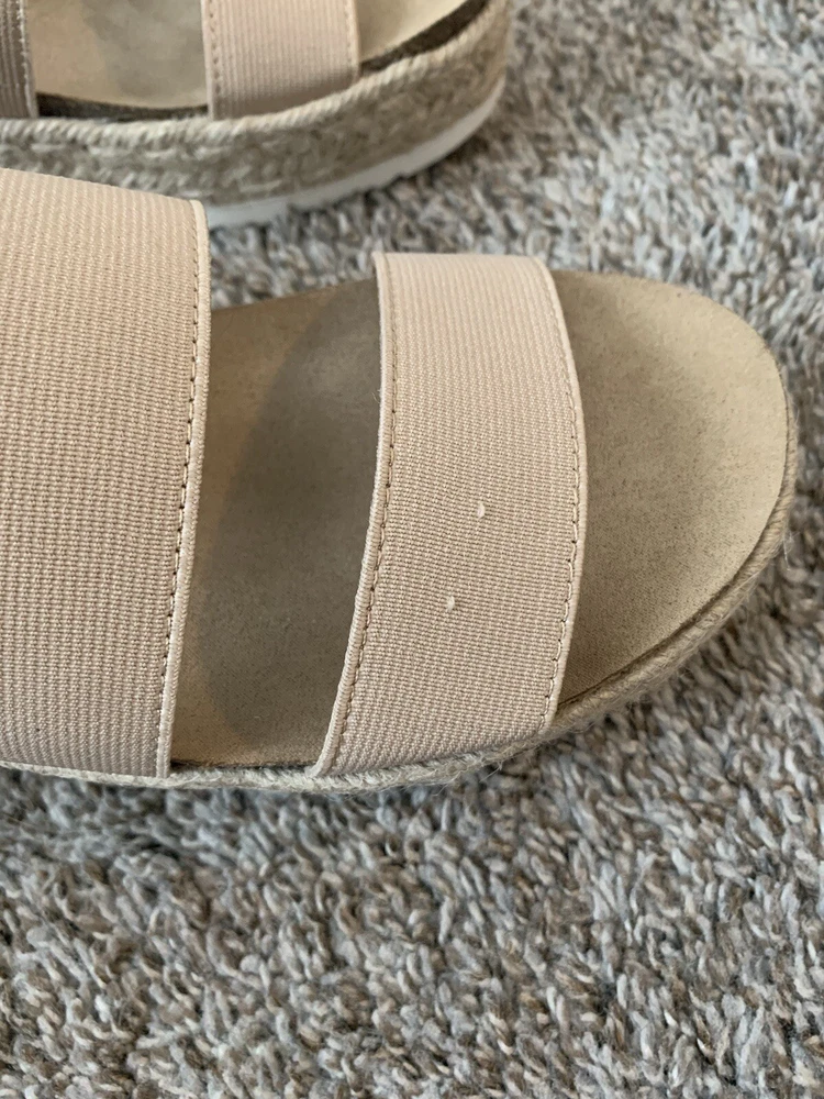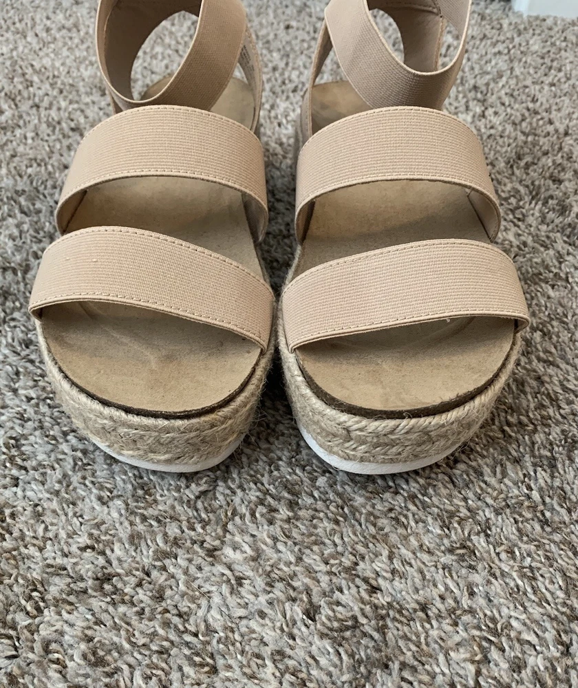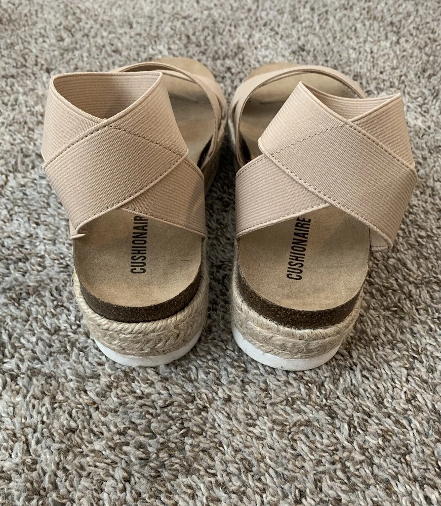 Cushionaire Mandy beige flatforms Elastic straps Approximately 2” heel Size 9 Small snag on top of right shoes Otherwise great condition