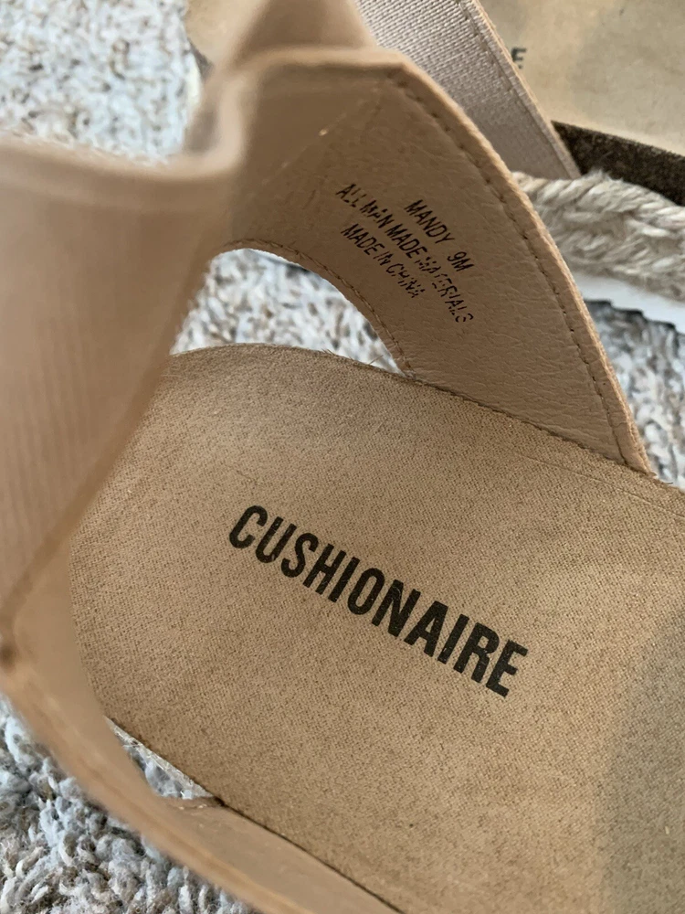 Occasion: Casual, Travel Heel Style: Wedge US Shoe Size: 9 Type: Sandal Vintage: No Season: Fall, Spring, Summer Model: Cushionaire Mandy Heel Height: Mid (2-2.9 in) Features: Ankle Strap, Comfort Personalize: No Customized: No Color: Beige Pattern: Solid Department: Women Character: Mandy Closure: Slip On Brand: CUSHIONAIRE Upper Material: Synthetic Style: Strappy