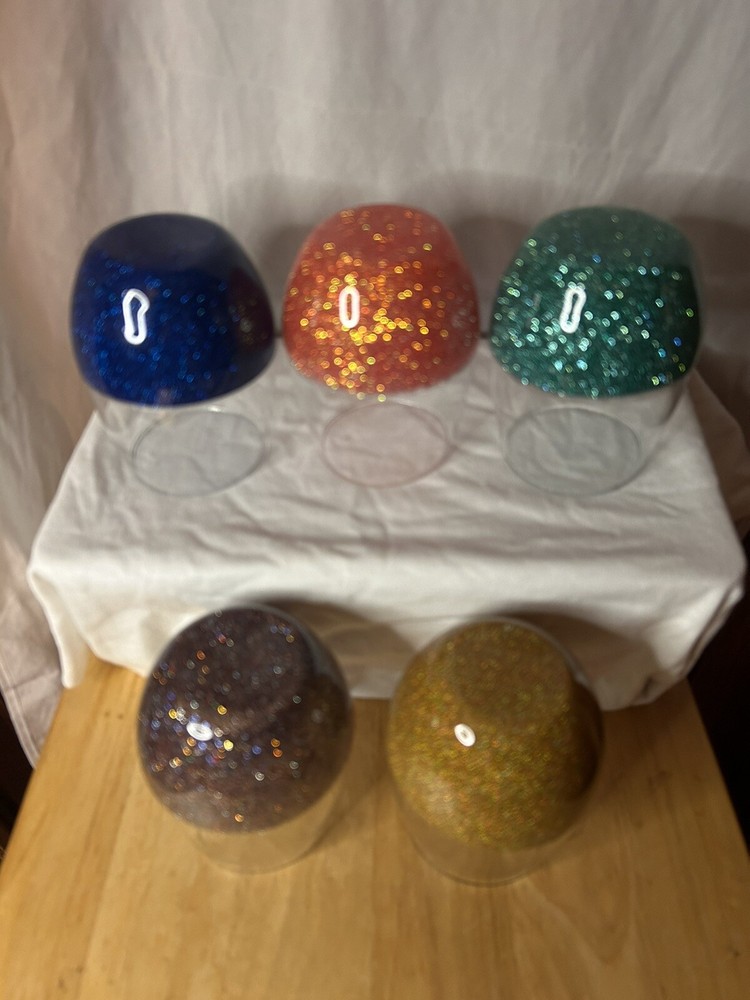 The product is a set of 5 custom wine glasses/tumblers in a variety of colors including pink, green, blue, gold, and silver. Each glass has a height of 5 inches and a capacity of 21 ounces. The glasses are made of silver material and are designed as tumblers, suitable for enjoying wine or other beverages. The versatile color options make this set a stylish addition to any home bar or kitchen, perfect for entertaining or everyday use. With glitter on the inside