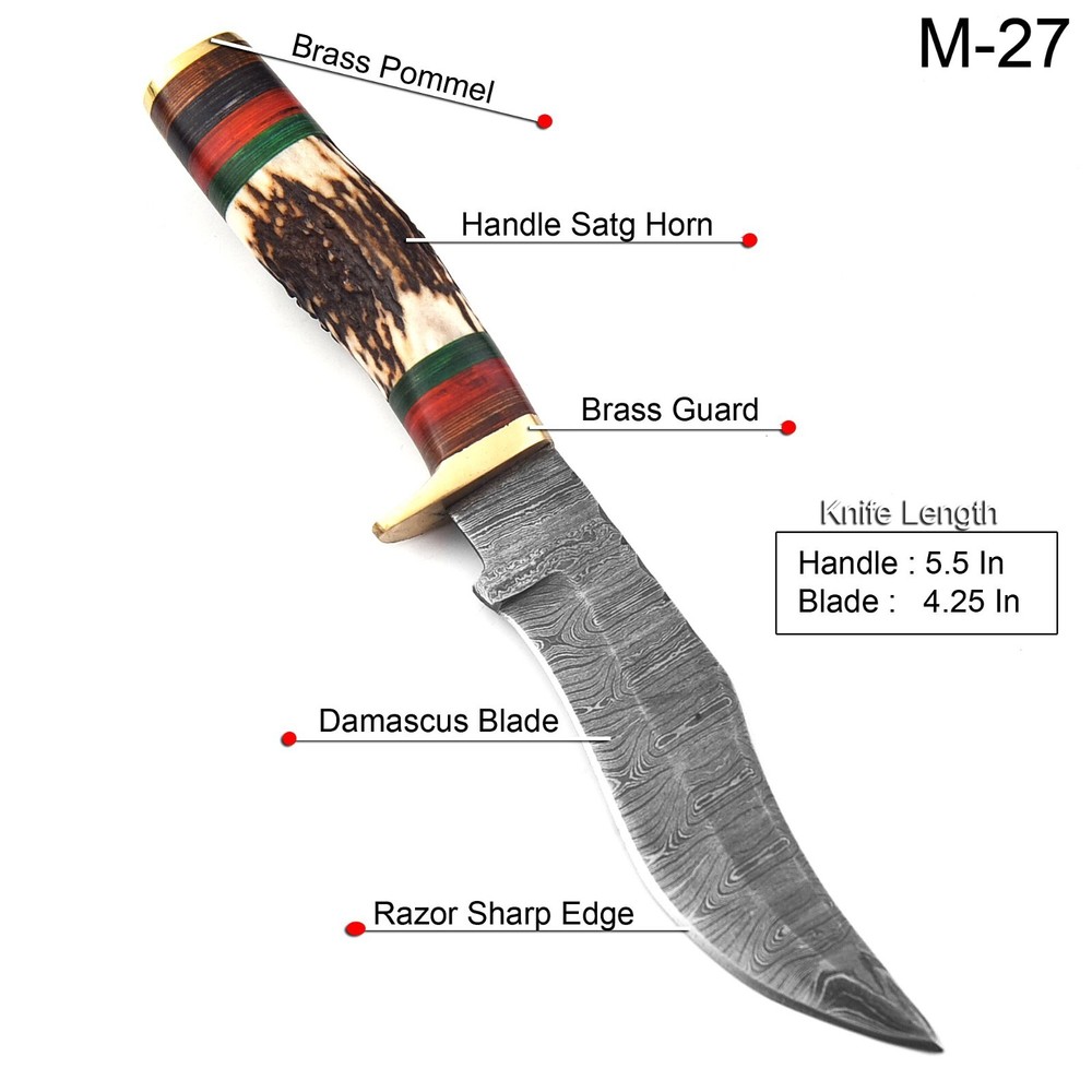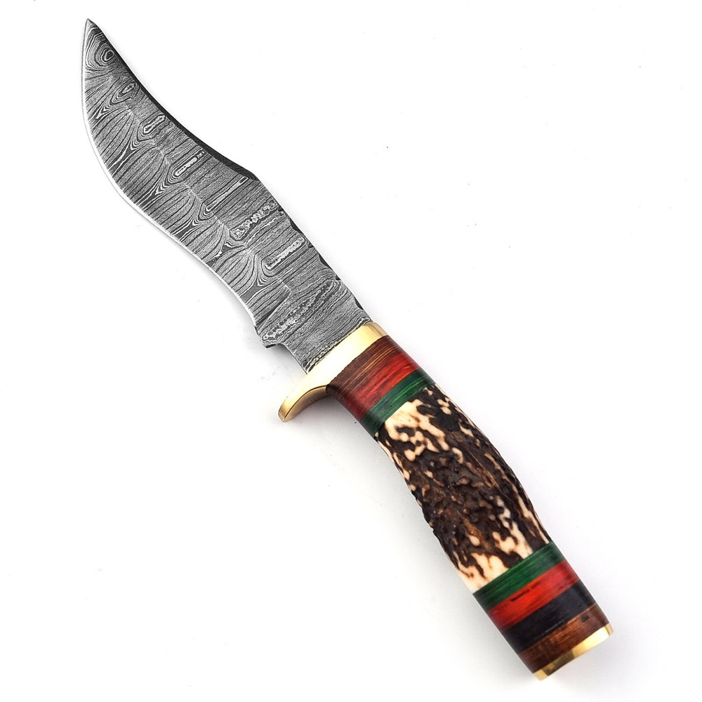 Description: CUSTOM HANDMADE HAND FORGED STAG HORN DAMASCUS STEEL Hunting KNIFE Specifications: Handle Material : Stag Horn + Brass Blade Material : Damascus steel Overall Length : 9.75 inches Handle Length : 5.5 inches Blade Length : 4.25 inches Layers: 512 Sheath: Leather Hardness: 55-58 HRC This superb design knife is hand forged. Blade of this knife has a nice file work and is made of 512 layers of stainless steel and high carbon steel with hardness 55-60 HRC. This process takes approximately 48 hours to complete. This robust knife is lab tested under intense conditions, the balance and shape of this knife ensures perfect grip. All our knives are handmade similar to the photo, differences as such as color and patterns of the natural materials used will differ somewhat because these are all natural materials. Every item will be considered as an original because no one item is ever identical to the other, they are handmade and natural materials are never identical. Because they are handmade they may have slight imperfections because they are NEVER MACHINE MADE and this makes it original in its own way. Package Includes: Knife with Original Leather Sheath AGE RESTRICTION: WE DON'T SELL KNIVES TO ANY ONE WHO IS UNDER AGE 18. WHEN YOU BUY A KNIFE FROM US YOU ARE CONFIRMING THAT YOUR AGE QUALIFIES FOR THIS PURCHASE AND THIS IS A LEGAL PURCHASE. Lift US TAKES NO RESPONSIBILITY FOR ANY ILLEGAL PURCHASE. Care Instructions: Keep the knife dry after each cleaning. Warning: Take care when removing product from packaging. Keep fingers clear of blades. Store away from children. We are not responsible for injuries caused by the use of this item. FEEDBACK POLICY: YOUR FEEDBACK IS VERY IMPORTANT FOR US, IF THEIR IS ANY KIND OF PROBLEM PLEASE GIVE US OPPORTUNITY TO SORT THE ISSUE We do sell wholesale, please contact us for special discounts on bulk orders. Best Regards TrendCutd