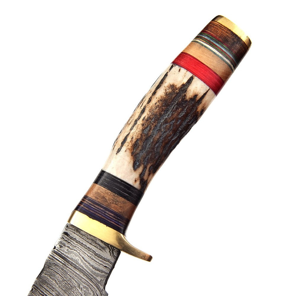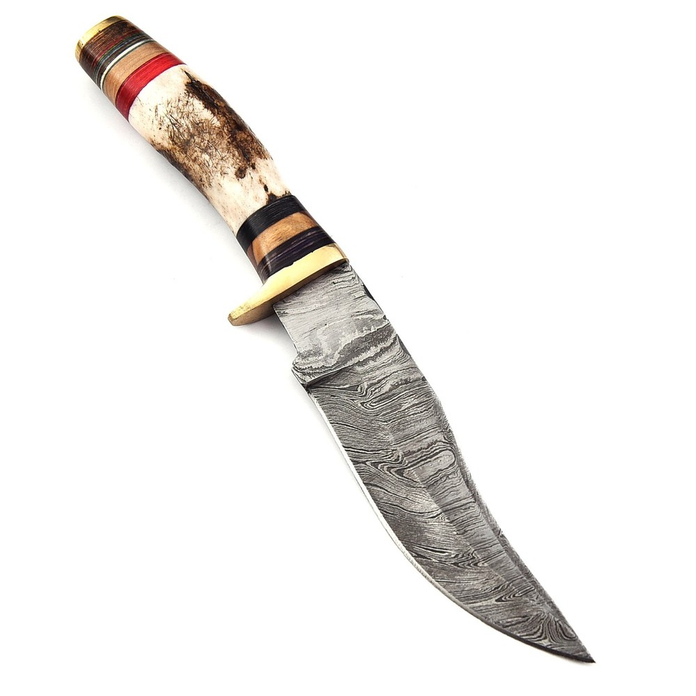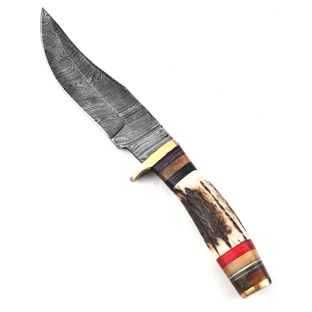 Description: CUSTOM HANDMADE HAND FORGED STAG HORN DAMASCUS STEEL Hunting KNIFE Specifications: Handle Material : Stag Horn + Brass Blade Material : Damascus steel Overall Length : 9.75 inches Handle Length : 5.5 inches Blade Length : 4.25 inches Layers: 512 Sheath: Leather Hardness: 55-58 HRC This superb design knife is hand forged. Blade of this knife has a nice file work and is made of 512 layers of stainless steel and high carbon steel with hardness 55-60 HRC. This process takes approximately 48 hours to complete. This robust knife is lab tested under intense conditions, the balance and shape of this knife ensures perfect grip. All our knives are handmade similar to the photo, differences as such as color and patterns of the natural materials used will differ somewhat because these are all natural materials. Every item will be considered as an original because no one item is ever identical to the other, they are handmade and natural materials are never identical. Because they are handmade they may have slight imperfections because they are NEVER MACHINE MADE and this makes it original in its own way. Package Includes: Knife with Original Leather Sheath AGE RESTRICTION: WE DON'T SELL KNIVES TO ANY ONE WHO IS UNDER AGE 18. WHEN YOU BUY A KNIFE FROM US YOU ARE CONFIRMING THAT YOUR AGE QUALIFIES FOR THIS PURCHASE AND THIS IS A LEGAL PURCHASE. Lift US TAKES NO RESPONSIBILITY FOR ANY ILLEGAL PURCHASE. Care Instructions: Keep the knife dry after each cleaning. Warning: Take care when removing product from packaging. Keep fingers clear of blades. Store away from children. We are not responsible for injuries caused by the use of this item. FEEDBACK POLICY: YOUR FEEDBACK IS VERY IMPORTANT FOR US, IF THEIR IS ANY KIND OF PROBLEM PLEASE GIVE US OPPORTUNITY TO SORT THE ISSUE We do sell wholesale, please contact us for special discounts on bulk orders. Best Regards TrendCutd