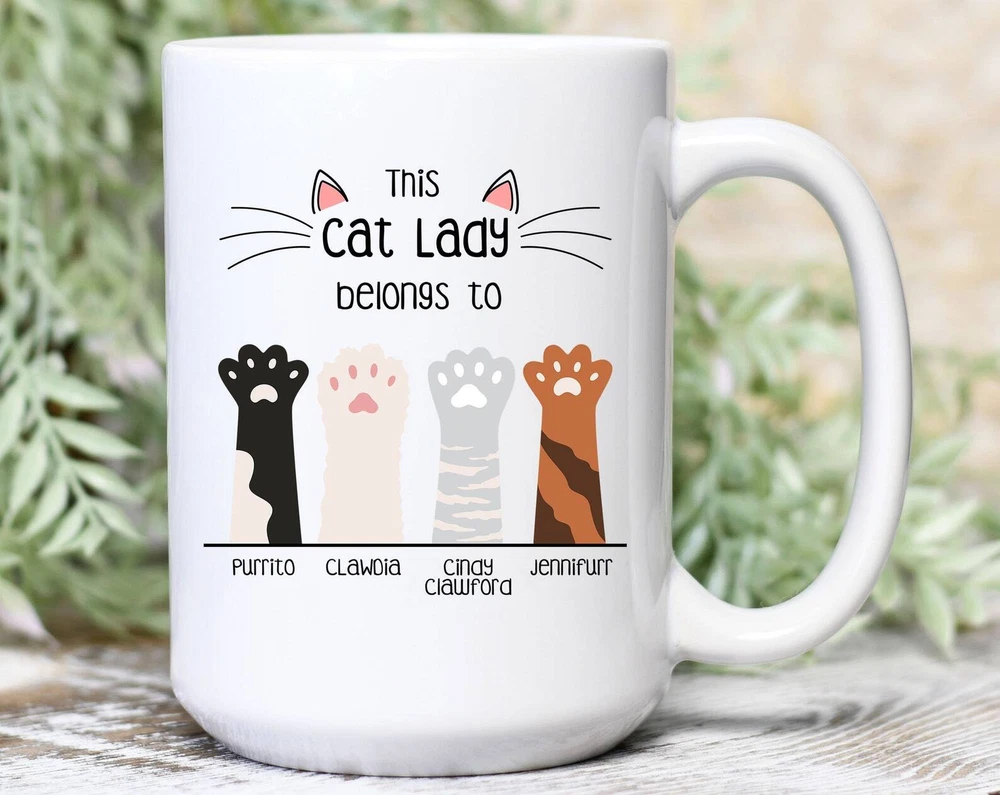 Custom Cat Mug Cat Obsessed Friend Gift Cat Mom Gift Cat Name Paw Mug Cat Lady Product Details.. This high quality 11oz. ceramic white mug has a premium hard coat that provides crisp and vibrant color reproduction sure to last for years. Perfect for all hot & cold beverages. The highest quality printing possible is used. It will never fade no matter how many times you wash it. Material: 100% Ceramic. Print both sides. Dishwasher and Microwave Safe. High Gloss + Premium White Finish. Printed in the U.S.A. Personalized & Custom. We support personalized and custom mug to add custom, when placing an order, you can add notes to the "order note" in shipping address section. Also you can contact us directly via message. Shipping Info. Ready to ship in 1 to 2 business days, All products are made-to-order and proudly printed in the United States. Shipped by USPS and DHL, You will receive your order in 5-7 days. Replace & Refund. All products are defective during shipping broken, chipped will be replaced free of charge. You are not satisfied with the product, we will refund 100% money to you. If any other issues arise, please do not hesitate to message, we would be more than happy to assist you.