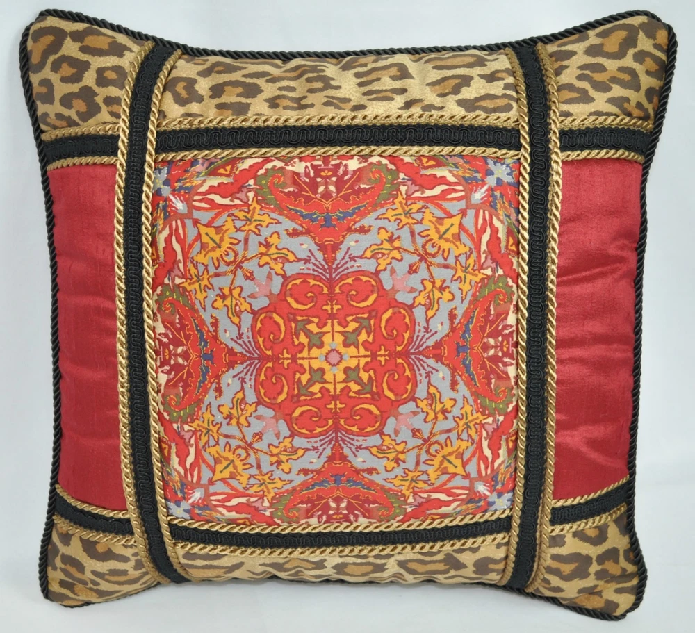 Custom sewn Accent Pillow made with Ralph Lauren Galahad, Dupioni Red Silk & Venetian Leopard Animal Print Fabric 16" x 16" approx. Satin Cording & Gimp trims the pillow. The back is the same Venetian Leopard fabric as the front and has a sham closure for removal of the insert. Insert is Foam. Any extra shipping paid will be refunded to your account. Check our eBay Store for other items that coordinate All items from a smoke & pet free environment .