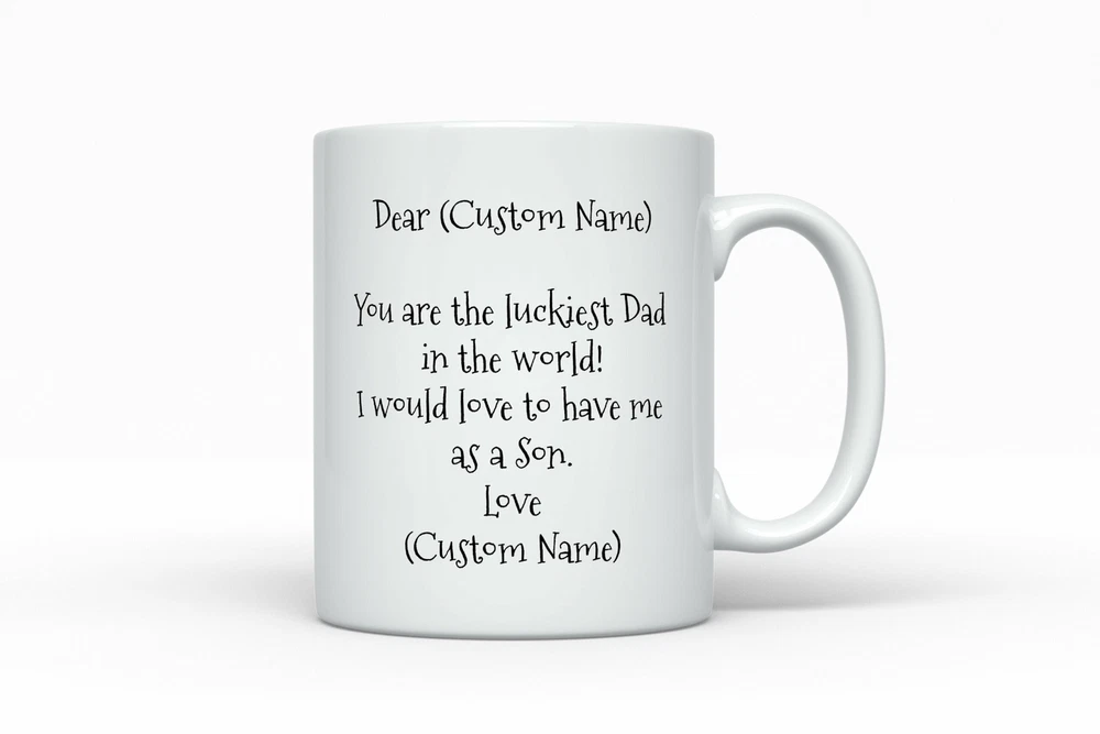 Custom Dad Coffee Mug To Dad From Son Personalized Dad Mug From Son Funny Custom Product Details.. This high quality 11oz. ceramic white mug has a premium hard coat that provides crisp and vibrant color reproduction sure to last for years. Perfect for all hot & cold beverages. The highest quality printing possible is used. It will never fade no matter how many times you wash it. Material: 100% Ceramic. Print both sides. Dishwasher and Microwave Safe. High Gloss + Premium White Finish. Printed in the U.S.A. Personalized & Custom. We support personalized and custom mug to add custom, when placing an order, you can add notes to the "order note" in shipping address section. Also you can contact us directly via message. Shipping Info. Ready to ship in 1 to 2 business days, All products are made-to-order and proudly printed in the United States. Shipped by USPS and DHL, You will receive your order in 5-7 days. Replace & Refund. All products are defective during shipping broken, chipped will be replaced free of charge. You are not satisfied with the product, we will refund 100% money to you. If any other issues arise, please do not hesitate to message, we would be more than happy to assist you.