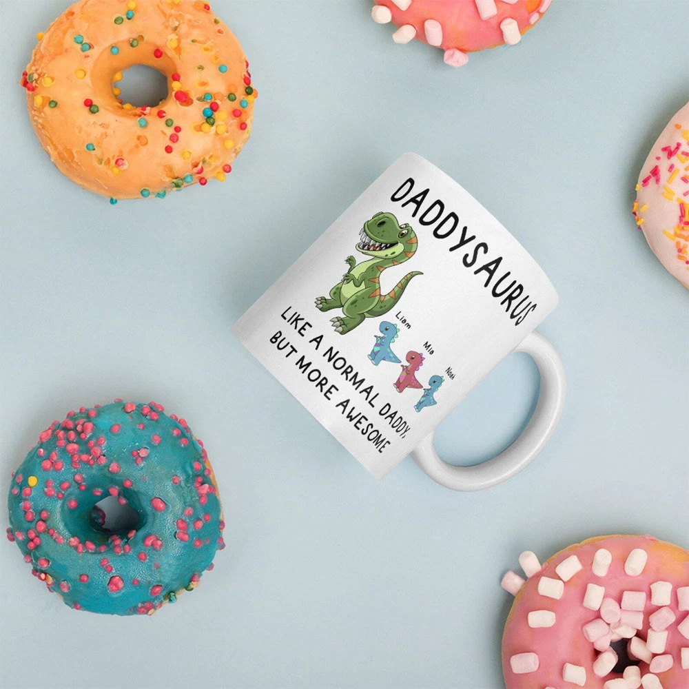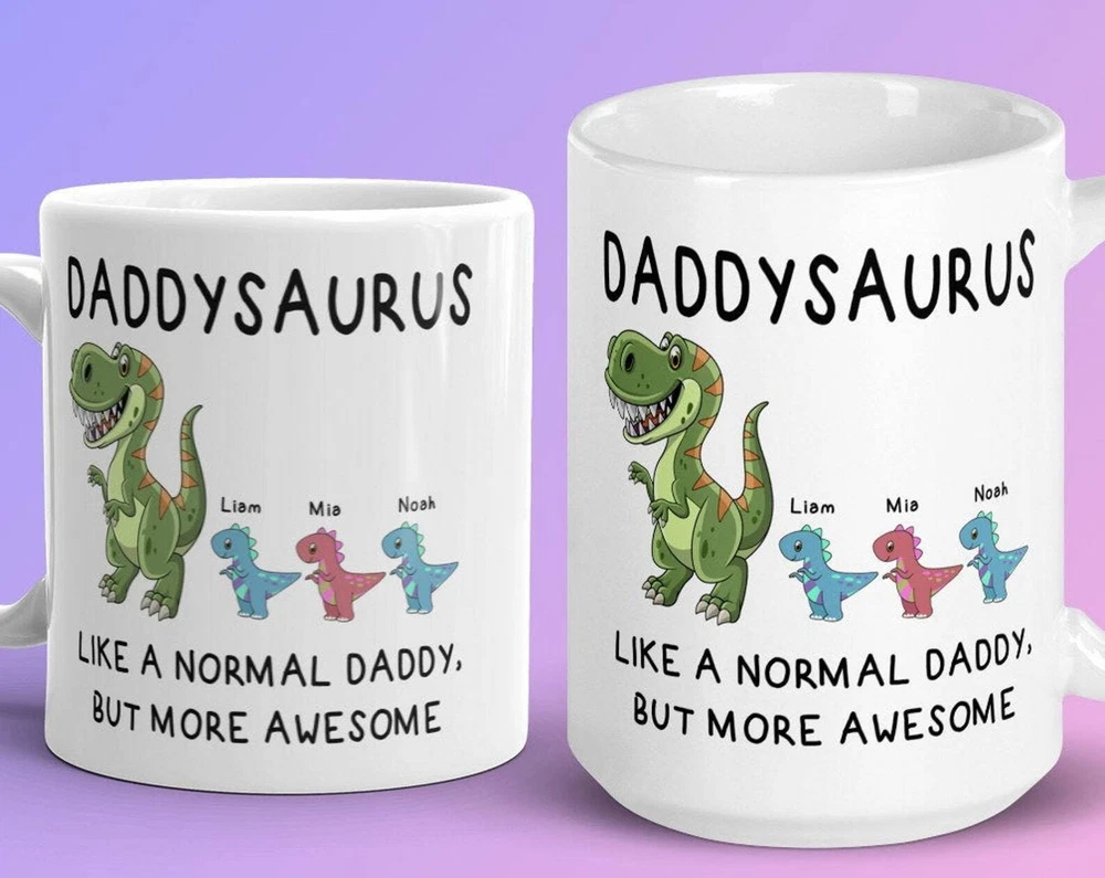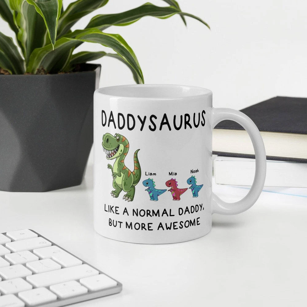 Custom Daddysaurus Mug Personalized Mug For Dadsaurus Papasaurus Coffee Mug Product Details.. This high quality 11oz. ceramic white mug has a premium hard coat that provides crisp and vibrant color reproduction sure to last for years. Perfect for all hot & cold beverages. The highest quality printing possible is used. It will never fade no matter how many times you wash it. Material: 100% Ceramic. Print both sides. Dishwasher and Microwave Safe. High Gloss + Premium White Finish. Printed in the U.S.A. Personalized & Custom. We support personalized and custom mug to add custom, when placing an order, you can add notes to the "order note" in shipping address section. Also you can contact us directly via message. Shipping Info. Ready to ship in 1 to 2 business days, All products are made-to-order and proudly printed in the United States. Shipped by USPS and DHL, You will receive your order in 5-7 days. Replace & Refund. All products are defective during shipping broken, chipped will be replaced free of charge. You are not satisfied with the product, we will refund 100% money to you. If any other issues arise, please do not hesitate to message, we would be more than happy to assist you.