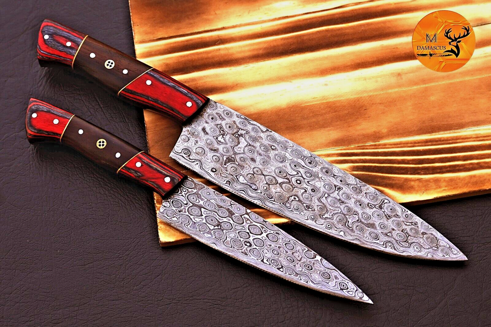 CUSTOM HAND MADE HAND FORGED DAMASCUS STEEL BLADE CHEF KNIFE STE Wood Handle This superb design knife is hand forged. Blade of this knife has a nice file work and is made of 512 layers of 4340 stainless steel and 1075 high carbon steel and hardness 55-58 HRC . This robust knife is lab tested under intense conditions, the balance and shape of this knife ensures perfect grip. Overall Pieces : 2 Chef Knife : Blade 7.5" Inches - Handle 5" Inches Steak Knife : Blade 4.5" Inches - Handle 4.5" Inches Damascus Design: Rain Drop Pattern Layers: 512 Care Instructions: Keep the knife dry after each cleaning. Warning: Keep fingers clear of blades. Store away from children.