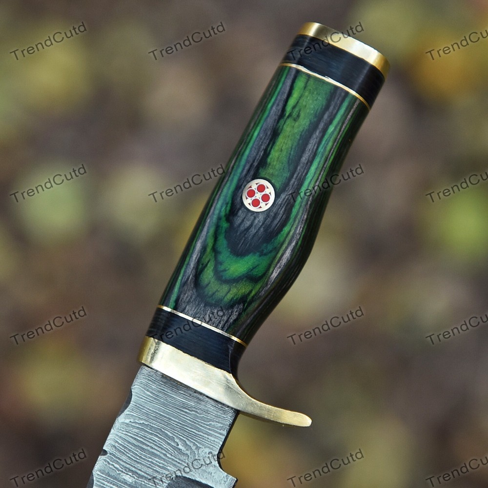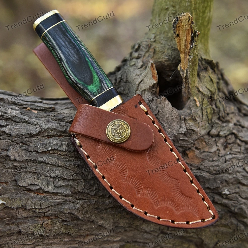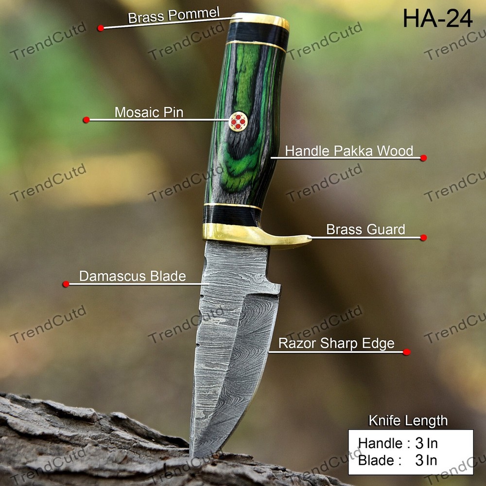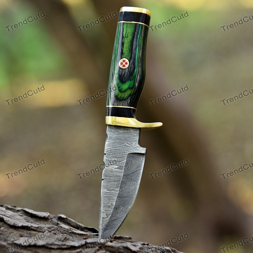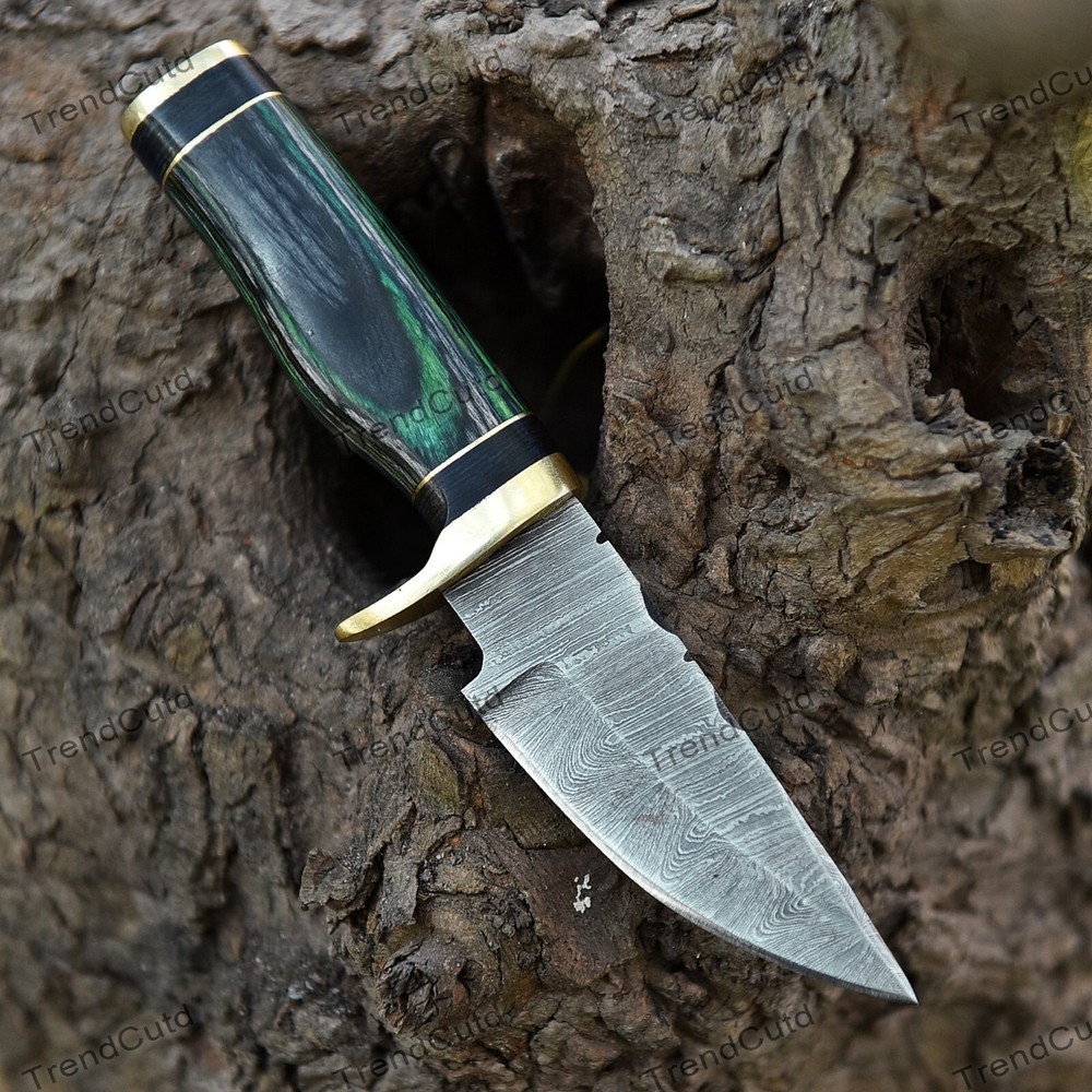Custom Handmade Damascus Steel Skinner Hunting Knife KNIFE MATERIAL: Blade: Damascus Handle: Pakka Wood & Brass Pommal & Brass Guard KNIFE MEASUREMENT: Overall Length= 6" Blade Length= 3" Handle Length=3" Trendcutd knives are handmade you will get the same knife as in the photo. A slight difference can be there in color and patterns because these are handmade items and we use natural material. These knife have perfect grip sharp cutting edge which makes our knives more durable. Tips To Care For Knife: 1. Clean your knife with gasoline or Ethanol after use. 2. Apply oil on the blade after cleaning & using the knife. 3. Never store the knife in sheath for long time as it may dull the sharpness of knife over time. DISCLAIMER: If you have any issue regarding our products and services you can always contact us any time we will try to resolve your issue as quickly as possible. Best Regards, Trendcutd