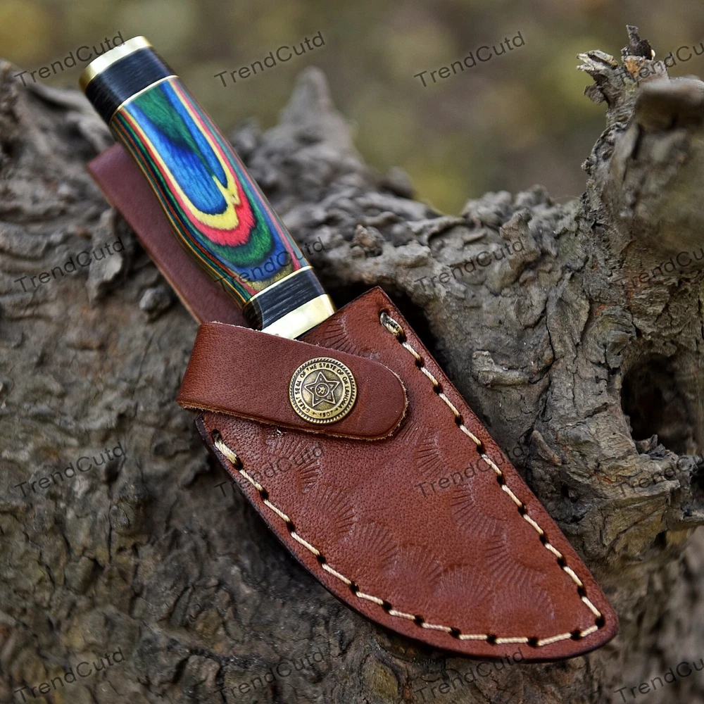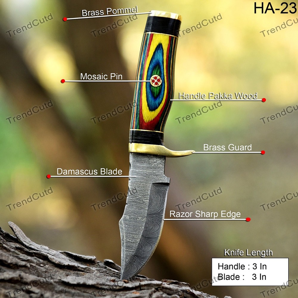 Custom Handmade Damascus Steel Skinner Hunting Knife KNIFE MATERIAL: Blade: Damascus Handle: Pakka Wood & Brass Pommal & Brass Guard KNIFE MEASUREMENT: Overall Length= 6" Blade Length= 3" Handle Length=3" Trendcutd knives are handmade you will get the same knife as in the photo. A slight difference can be there in color and patterns because these are handmade items and we use natural material. These knife have perfect grip sharp cutting edge which makes our knives more durable. Tips To Care For Knife: 1. Clean your knife with gasoline or Ethanol after use. 2. Apply oil on the blade after cleaning & using the knife. 3. Never store the knife in sheath for long time as it may dull the sharpness of knife over time. DISCLAIMER: If you have any issue regarding our products and services you can always contact us any time we will try to resolve your issue as quickly as possible. Best Regards, Trendcutd