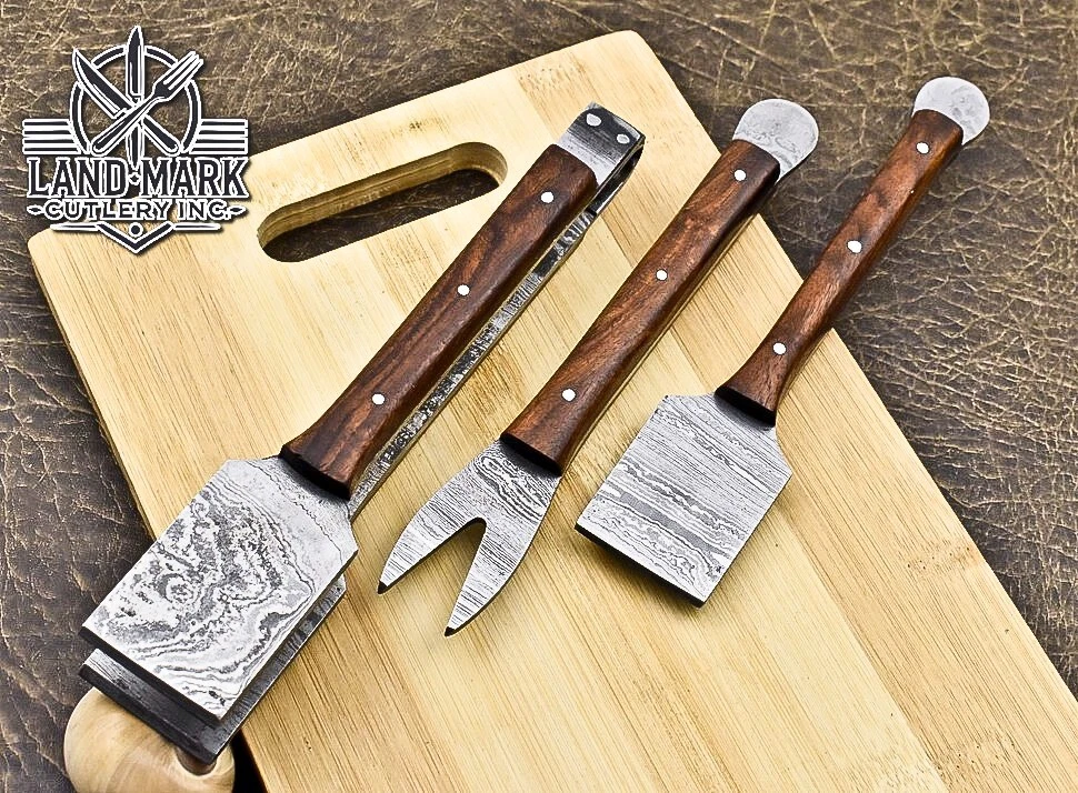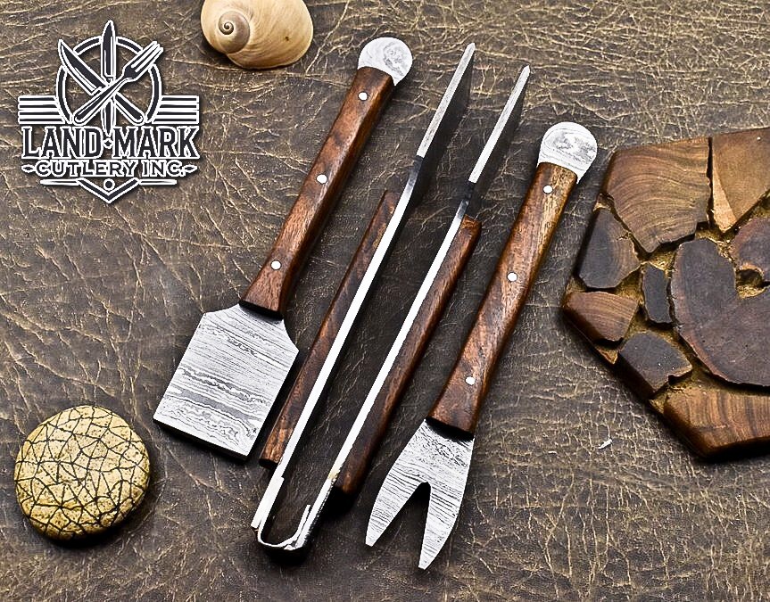 Custom Hand Made DAMASCUS STEEL HUNTING BBQ SET WITH ROSE WOOD HANDLE We offer a shipping discount for More then one purchased . And discount will be apply on combine invoice, Discount will not apply on separate payment. ITEM DETAILS OVER ALL LENGTH 12.0 inches long (Approx) BLADE HARDNESS 58-60 HRC Which Holds The Sharp Edge For Long Time. HANDLE ROSE WOOD COVER NO This Awesome custom made KNIFE has a nice hand forged with the combination of 4340 & 1080 steel. HOW OUR DAMASCUS IS MADE: All our Damascus is real and not just an acid etch. Damascus is a mixture of 1080HC and 4340 nickel carbon. You heat them up together and then fold the bar over and over to get the desired layers, ours are 396 layers. Then you burn the blade in acid, and it turns the nickel satin color and the high carbon turns blackish gray. This is how the layers are exposed to show the layers of the new steel created coined "Damascus". All Damascus is acid etched to show the layers. If you high polish the metal it will be shinny satin like all steels. Only after you burn the sides of the blade with acid do you see the layers of the two steels. Makes sense? After we make our knives we high polish the handles and put an edge on the blade. The high polishing buffs off the acid burned layer of the handle, and the blade edge is sharpened and the acid burned edge becomes satin. You can re-burn the tang of the blade near the handles and the edge of the blade and it will show the layers once more. All our knives are hand made, durable and unique ***** YOU WILL RECEIVED THE SAME KNIFE Qality Standards Our Damascus blades are made from high quality non-stainless steels which rival or exceed any Damascus blade made from the 10 series with 4340. Our Damascus combination has taken years to perfect and has been tested under a variety of application which will offer professional performance in categories of toughness, strength (lateral stress) and edge honing and holding ability. In a 5 spot Rockwell test our blades will average near or close to 58 which offers a perfect balances between its toughness and strength.Our blades due to carbon content need to be regularly treated with wax and/or 3 in 1 oil to maintain its superior quality. Questions if you have any question feel free to send us message we aim to answer all questions within 24 hours Feedback If you are not satisfied with our service please contact us before leaving any negative or natural feedback. We will resolve all issues as quickly as possible. Disclaimer We are not responsible for any injuries associated with the use of our tools. Our products are intended for legal use only by responsible buyers. Therefore, we will not sell our products to anyone under the age of 18. Before bidding please check your country laws as some countries Custom don't allow this. If your purchase is held by Custom Authorities in your country/State we will not be responsible for that and no refund will be issued Shipping We offer a 20% shipping discount for More then one purchased . And discount will be apply on combine invoice, Discount will not apply on separate payment We ship within 24 hours after receiving complete payment but this can be delayed due to week ends or Governments and Religious Festivals . . This is beyond our control and we apologize for this inconvenience. Precautions Our Tools are very sharp so open and use them very carefully We are not responsible for any injuries associated with the use of our tools Tips to Care knife 1. NEVER STORE YOUR KNIFE FOR LONG TIME IN LEATHER SHEATH. 2. LEATHER CAN ABSORB WATER, WHICH WILL RUST THE KNIFE. 3. ALWAYS CLEAN THE BLADE AFTER USING WITH OIL OR WAX
