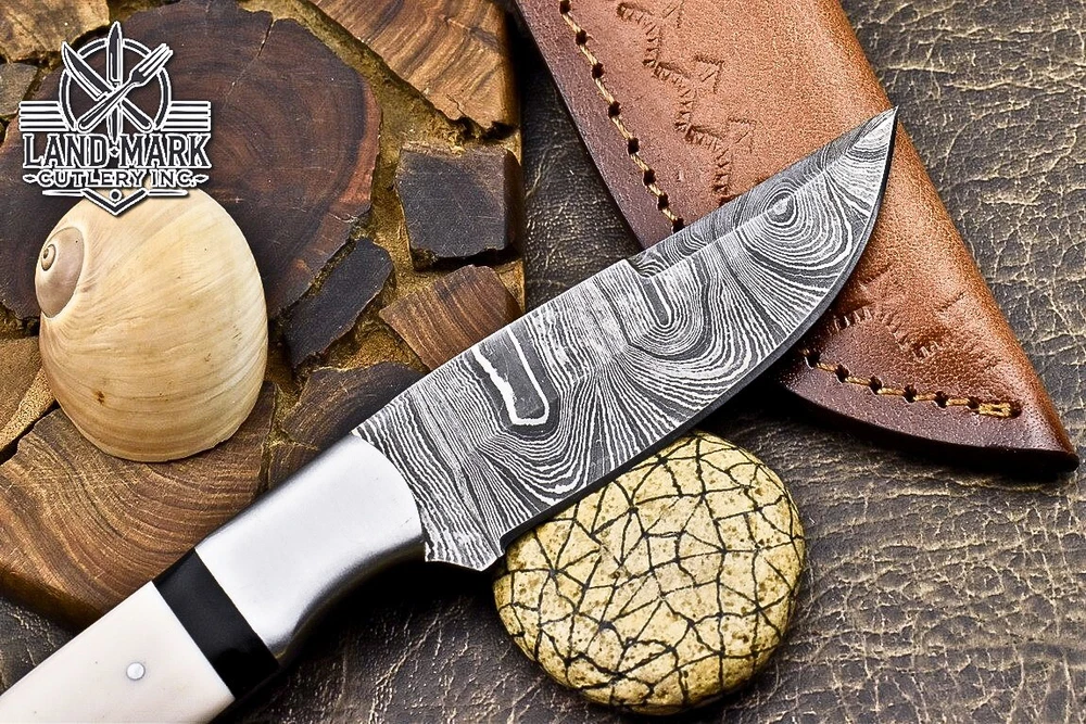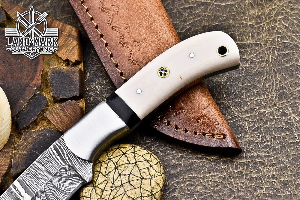 Custom Hand Made DAMASCUS STEEL HUNTING KNIFE WITH WHITE HANDLE We offer a shipping discount for More then one purchased . And discount will be apply on combine invoice, Discount will not apply on separate payment. ITEM DETAILS OVER ALL LENGTH 8.0 inches long (Approx) HANDLE LENGTH 4.0 inches long (Approx) BLADE LENGTH 4.0 inches long (Approx) BLADE HARDNESS 58-60 HRC Which Holds The Sharp Edge For Long Time. HANDLE RESIN COVER LEATHER SHEATH This Awesome custom made KNIFE has a nice hand forged with the combination of 4340 & 1080 steel. HOW OUR DAMASCUS IS MADE: All our Damascus is real and not just an acid etch. Damascus is a mixture of 1080HC and 4340 nickel carbon. You heat them up together and then fold the bar over and over to get the desired layers, ours are 396 layers. Then you burn the blade in acid, and it turns the nickel satin color and the high carbon turns blackish gray. This is how the layers are exposed to show the layers of the new steel created coined "Damascus". All Damascus is acid etched to show the layers. If you high polish the metal it will be shinny satin like all steels. Only after you burn the sides of the blade with acid do you see the layers of the two steels. Makes sense? After we make our knives we high polish the handles and put an edge on the blade. The high polishing buffs off the acid burned layer of the handle, and the blade edge is sharpened and the acid burned edge becomes satin. You can re-burn the tang of the blade near the handles and the edge of the blade and it will show the layers once more. All our knives are hand made, durable and unique ***** YOU WILL RECEIVED THE SAME KNIFE Qality Standards Our Damascus blades are made from high quality non-stainless steels which rival or exceed any Damascus blade made from the 10 series with 4340. Our Damascus combination has taken years to perfect and has been tested under a variety of application which will offer professional performance in categories of toughness, strength (lateral stress) and edge honing and holding ability. In a 5 spot Rockwell test our blades will average near or close to 58 which offers a perfect balances between its toughness and strength.Our blades due to carbon content need to be regularly treated with wax and/or 3 in 1 oil to maintain its superior quality. Questions if you have any question feel free to send us message we aim to answer all questions within 24 hours Feedback If you are not satisfied with our service please contact us before leaving any negative or natural feedback. We will resolve all issues as quickly as possible. Disclaimer We are not responsible for any injuries associated with the use of our tools. Our products are intended for legal use only by responsible buyers. Therefore, we will not sell our products to anyone under the age of 18. Before bidding please check your country laws as some countries Custom don't allow this. If your purchase is held by Custom Authorities in your country/State we will not be responsible for that and no refund will be issued Shipping We offer a 20% shipping discount for More then one purchased . And discount will be apply on combine invoice, Discount will not apply on separate payment We ship within 24 hours after receiving complete payment but this can be delayed due to week ends or Governments and Religious Festivals . . This is beyond our control and we apologize for this inconvenience. Precautions Our Tools are very sharp so open and use them very carefully We are not responsible for any injuries associated with the use of our tools Tips to Care knife 1. NEVER STORE YOUR KNIFE FOR LONG TIME IN LEATHER SHEATH. 2. LEATHER CAN ABSORB WATER, WHICH WILL RUST THE KNIFE. 3. ALWAYS CLEAN THE BLADE AFTER USING WITH OIL OR WAX