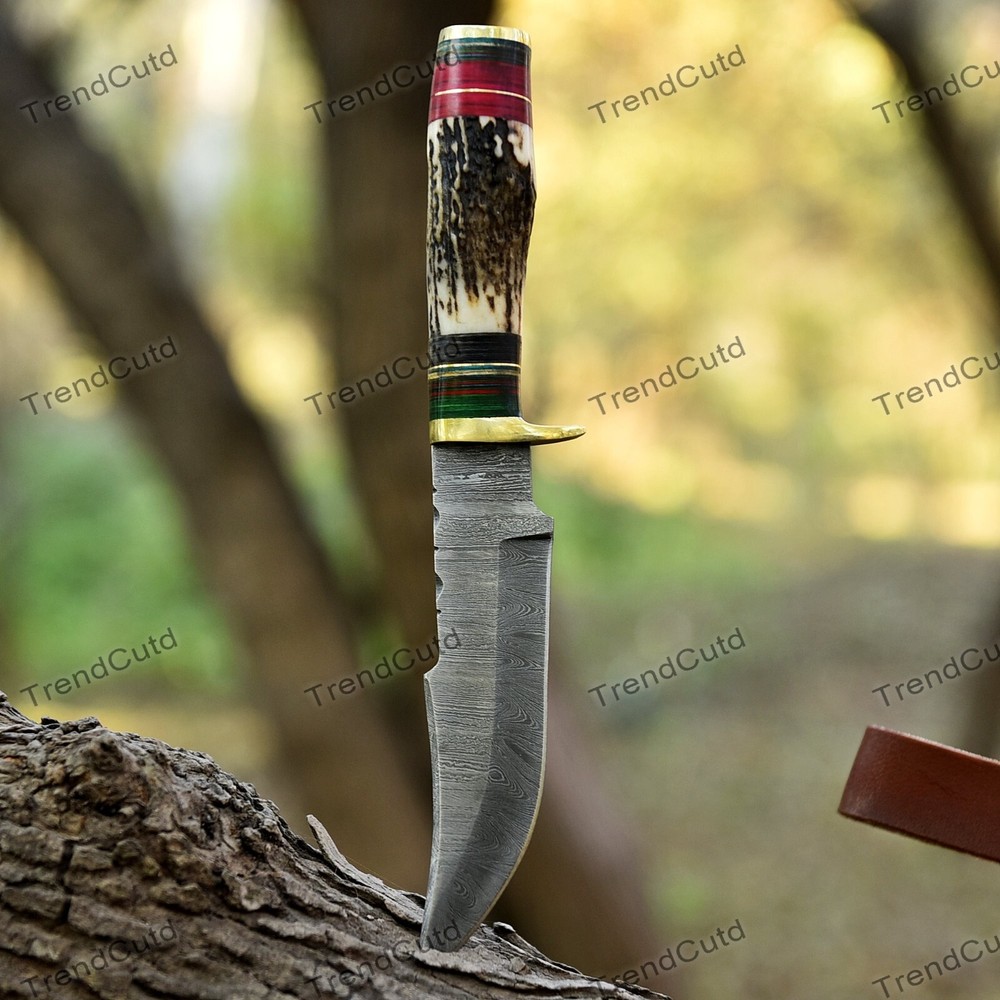 Description: CUSTOM HANDMADE HAND FORGED STAG HORN DAMASCUS STEEL Hunting KNIFE Specifications: Handle Material : Stag Horn + Brass Blade Material : Damascus steel Overall Length : 9.75 inches Handle Length : 5.5 inches Blade Length : 4.25 inches Layers: 512 Sheath: Leather Hardness: 55-58 HRC This superb design knife is hand forged. Blade of this knife has a nice file work and is made of 512 layers of stainless steel and high carbon steel with hardness 55-60 HRC. This process takes approximately 48 hours to complete. This robust knife is lab tested under intense conditions, the balance and shape of this knife ensures perfect grip. All our knives are handmade similar to the photo, differences as such as color and patterns of the natural materials used will differ somewhat because these are all natural materials. Every item will be considered as an original because no one item is ever identical to the other, they are handmade and natural materials are never identical. Because they are handmade they may have slight imperfections because they are NEVER MACHINE MADE and this makes it original in its own way. Package Includes: Knife with Original Leather Sheath AGE RESTRICTION: WE DON'T SELL KNIVES TO ANY ONE WHO IS UNDER AGE 18. WHEN YOU BUY A KNIFE FROM US YOU ARE CONFIRMING THAT YOUR AGE QUALIFIES FOR THIS PURCHASE AND THIS IS A LEGAL PURCHASE. Lift US TAKES NO RESPONSIBILITY FOR ANY ILLEGAL PURCHASE. Care Instructions: Keep the knife dry after each cleaning. Warning: Take care when removing product from packaging. Keep fingers clear of blades. Store away from children. We are not responsible for injuries caused by the use of this item. FEEDBACK POLICY: YOUR FEEDBACK IS VERY IMPORTANT FOR US, IF THEIR IS ANY KIND OF PROBLEM PLEASE GIVE US OPPORTUNITY TO SORT THE ISSUE We do sell wholesale, please contact us for special discounts on bulk orders. Best Regards TrendCutd