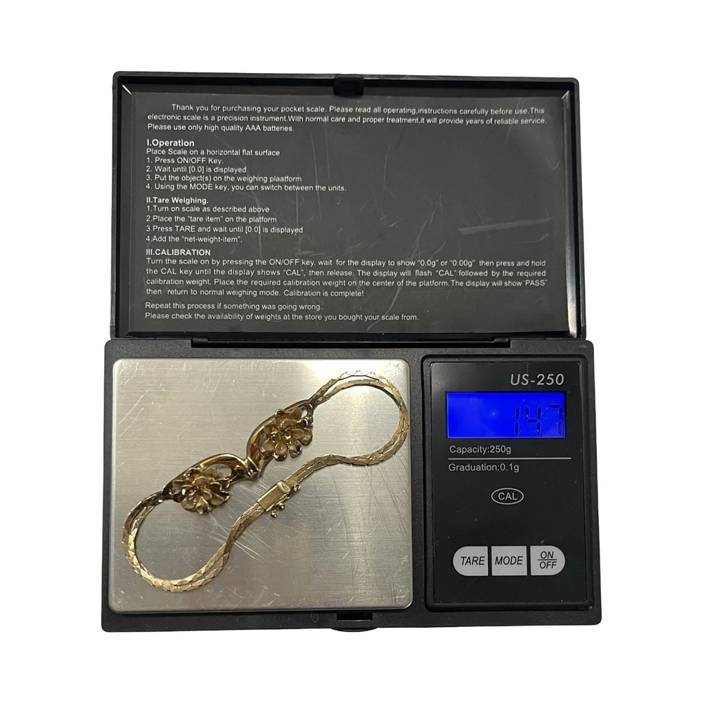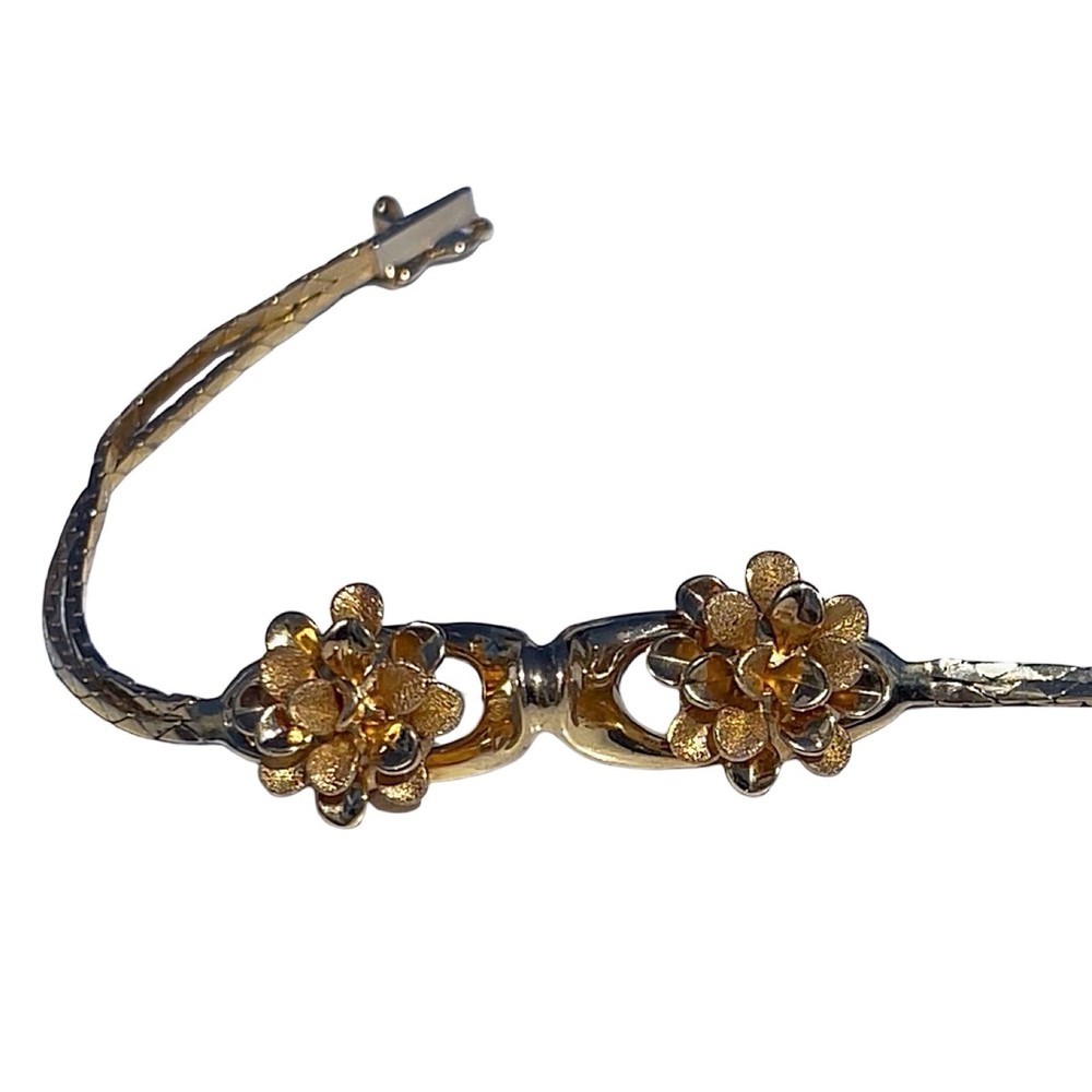 This elegant gold floral Bracelet adds a touch of sophistication to any outfit. Perfect for special occasions or everyday wear. • Stunning Custom Designed One of a Kind Antique Flower Charm Bracelet! • 14k Fine Italian Solid Gold! • Weight: 14.7 grams. • Length: 7.5 inches. Note: Current scrap metal price for 14.7 grams is approximately $900. SERIOUS BUYERS ONLY. This listing includes one bracelet. Should you be interested in purchasing the matching necklace along with the Bracelet together, feel free to message me.
