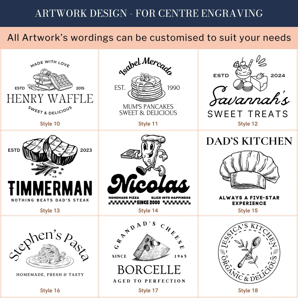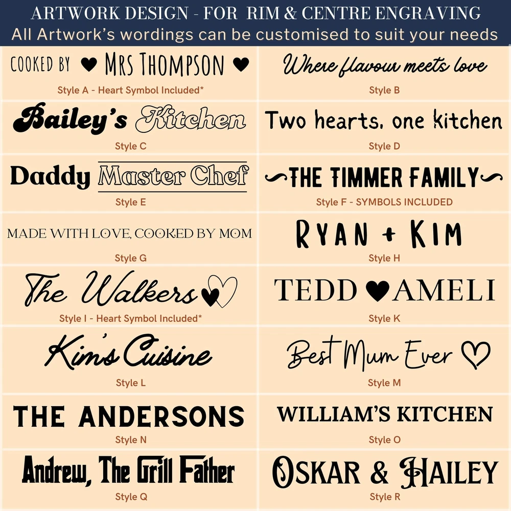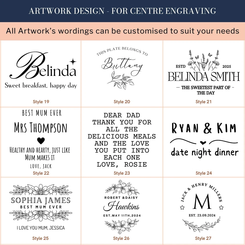 Custom Engraved Enamel Camping Retro Deep Soup Plate Custom Engraved Enamel Camping Retro Deep Soup Plate DETAILS ★ Discover the Perfect Enamel Soup Plates: Ideal for both indoor and outdoor dining: Enjoy your favourite meals with our distinctive Enamel Plates. Whether it's a personalised plate that brings a traditional style to your table or an adventurer's enamel plate perfect for camping and picnics, these plates are a must-have. They make a wonderful gift for the adventurer in the family or any friend who loves the outdoors! Perfect for hiking trips, camping weekends, lazy beach days, and picnics, these plates add a unique touch to your table setting. ★ Retro Charm and Timeless Design - Our Enamel Plates feature a classic blue and white finish reminiscent of American diners, adding a nostalgic touch that guests will love. - The retro blue and white enamel design not only enhances the aesthetic appeal but also makes a statement on any table. The blue rim creates a unique look and makes it easy for people to identify the edge of the plate, ideal for care homes or those with vision difficulties. ★ Perfect for Any Dessert & Food: Ideal for both indoor and outdoor dining, our versatile soup plates add a touch of style to every meal. Whether you're serving hearty soups, pasta, cold meats, steak, sandwiches, BBQ, cheese, puddings, desserts, ice cream, homemade cakes, pancakes, waffles, sweet treats, breakfast, and more, these plates make every dish look and taste even better. ★ Timeless Design: The retro blue and white enamel design not only enhances aesthetic appeal but also makes a statement on any table, elevating the presentation of your food. The blue rim creates a unique look and makes it easy for people to identify the edge of the plate, ideal for care homes or those with vision difficulties. ★ Durable and Long-Lasting: Crafted from heavy-duty stainless steel and covered with an ultra-durable, fuséd-glass coating, these plates develop a unique character over time. The enamel coating is heat and chemical resistant, making these plates highly versatile. They are safe for use in the oven and microwave for reheating food and can be easily cleaned in the dishwasher. The stainless-steel interior ensures long-lasting durability, even in customer-facing environments. ★ Exceptional Versatility: The enamel coating on these soup plates is both heat and chemical resistant, allowing you to serve homemade ice cream directly from the freezer or bake a delicious apple crumble in the oven. These bowls can handle it all. ★ Personalisation Options: Personalise your Enamel Kitchenware with initials, a name, or a custom logo to create a unique, personalised piece that reflects your style and identity. They make exceptional gifts for kids, Father’s Day, Mother’s Day, teachers, wedding favours, birthdays, housewarmings, couples, and any occasion where a thoughtful touch is appreciated. Choose from a wide range of designs to find the perfect match. ★ Ideal for Various Settings: Designed to withstand the rigours of everyday use, cleaning, and storage, our Enamel Tableware are equally at home in commercial settings like restaurants, cafes, and hotels. Their durability ensures they maintain a fresh appearance even with frequent use. It can be safely uséd it in the oven and microwave when reheating drinks. ★ Corporate Gifting and Promotions: Enhance your business relationships by personalising Enamel Plates with client names, monograms, or company logos. They make memorable closing gifts or promotional items that leave a lasting impression. ★ Stylish: Choose from a wide range of design options to personalise your plate, ensuring it reflects your unique style. ★ Safe: BPA-free and crafted with quality materials, our enamel tableware are designed with your safety and satisfaction in mind. ★ Care Instructions: - Our enamel tableware can be washed in the dishwasher, ensuring quick and convenient cleaning. The classic retro blue and white enamel tableware gains a unique character with repeated use, as chips and imperfections contribute to its individual charm. - To maintain a flawless appearance, avoid using the dishwasher. Clean gently with non-abrasive cleaners and avoid scourers to preserve the enamel finish. SPECIFICATIONS Dimensions : H x D: 60 x 245 mm Diameter ( 2.36" x 9.65" ) Material: Enamel Steel, Fuséd Glass Coating Technique: Laser Engraved. Personalise any design with names, dates, templates, logos, or images. Our high-quality, long-lasting laser engraving surpasses vinyl stickers, ensuring durability and a professional finish. Note: Chips and imperfections are part of products' individual look. HOW TO ORDER 1. Choose your Engraving Side: Select whether you want engraving on the top or bottom rim, the centre of the plate, or both. 2. Type in Engraving Style and Order: Specify the engraving style and the exact text you want engraved based on our provided Design Template Options. You can add any additional instructions in brackets (). Please refer to Style #A - Style #R for the Plate Rim's Engraving Example: - Top Rim: Style #O: Timothy Harrington - Bottom Rim: Style #O: Amelia Harrington - Centre: Style #9: mr&mrs Harrington, 05th May 2025 ▸If you want to use your own logo, please attach/ send us your file once you finish . Please note to attach the highest resolution file as possible to avoid quality issues Not all files are scanned prior to manufacturing, if you're not sure, please send us an email after placing the order to confirm if the file is of an acceptable quality. ▸You can combine or pick any font, icon, style, etc between our provided designs, or choose not to include a date, title or icon for example. All artwork based on our available design is free of charge. ▸If you don't like any of our template and want to create your own bespoke artwork design, please feel free to contact us with any questions you may have, a small additional fee may apply. DELIVER