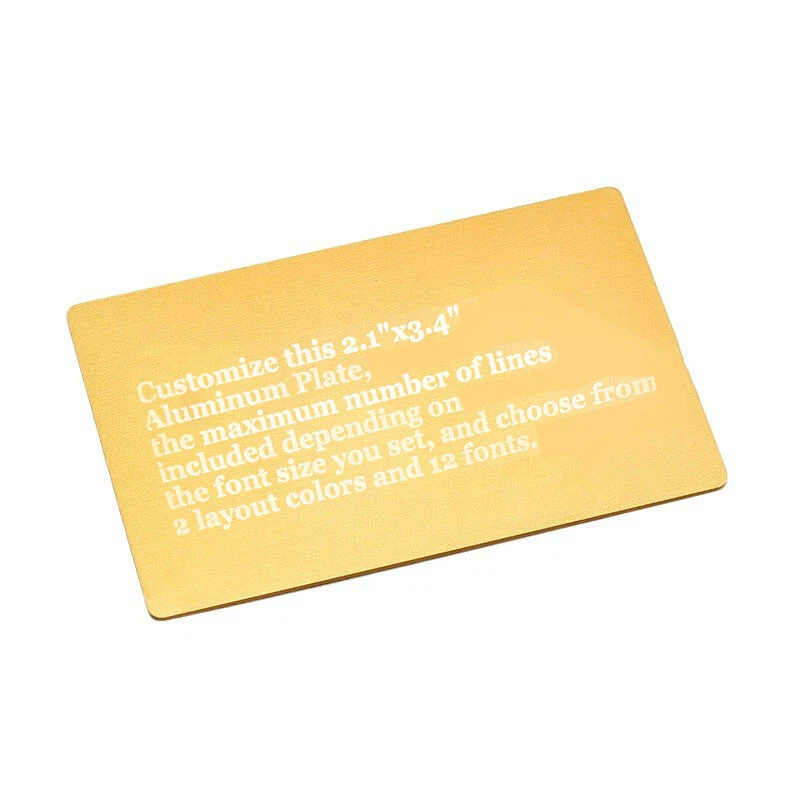 Descriptio ns : Our plates are great for personalizing any project. Perfect for all of your personalization needs such as: Flag Case, Awards, Taxidermy, Trophy, Memorial, Pet Memorial, Boy Scouts, Cub Scouts, Arrow of Light, Fantasy Football, School Projects, Church, Club, Identification tags, Employee, Recognition Plaques, etc Plate Specifica tio ns : 1. Color random delivery, if you especially like the color, you can leave a note in the order! 2. Both sides can be marked 3. Plate color: B lack & Silver & Gold 4. Material: aluminum 5. Plate Size: 8.6x5.4cm / 2.1x3.4in 6. The maximum number of lines included depending on the font size you set, and choose from 2 layout colors and 12 fonts. Order Proces s : After the purchase please send your desired engraving Text or sample design (Text and Fonts) We can also engrave logos or club badges, but this must be clarified with us before the purchase. Simply write to us via " Contact seller ". Promotio n s : Buy 3 Get 1 Free, you'll receive a total of 4. Buy 5 Get 2 Free, you'll receive a total of 7.