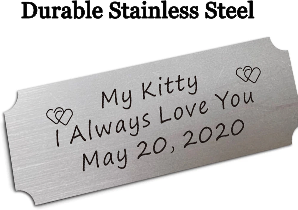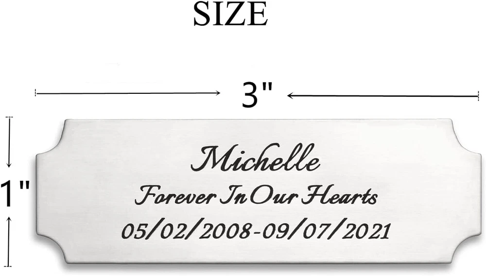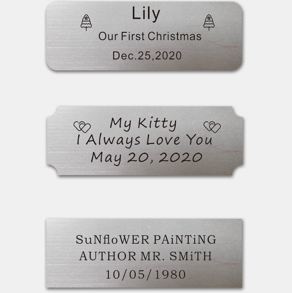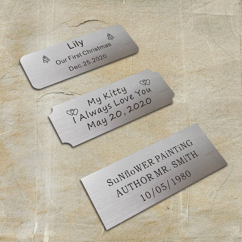 *****FOR THIS PLATE: THREE LINES MAX (35 CHARACTERS MAX PER LINE)***** Please do not type more than the character limit. These plates are custom designed by a graphic artist. View the font and image option thumbnails at the top of this listing. Tell us your font and image of choice, send us your own custom text for engraving, and we will take care of the rest! Included with your plate will be: - Up to three lines of your own custom engraved text (35 characters per line max) - YOUR CHOICE of mounting method. Adhesive backing (already attached for easy mounting) or holes punched with screws included. If you don't request a mounting method, we will place adhesive on the back for easy mounting. - YOUR CHOICE of plate corner style. Choose from squared, rounded or notched. If you don't request a corner style, we will keep your plate squared. - YOUR CHOICE of font from our font library (see thumbnail photos at the top of this listing for options). - YOUR CHOICE of image from our image library (see thumbnail photos at the top of this listing for options). This plate measures: 3" W x 1" H HOW TO ORDER 1. Click "Add to cart” 2. On the checkout page, click the little link that reads, "Message to seller" Plate mounting prep: Adhesive OR holes with screws. Plate corner style: squared, rounded or notched. Fonts available: See thumbnail pictures in this listing for entire font selection. Images available: See thumbnail pictures in this listing for entire image selection. These plates are meant for indoor applications only.