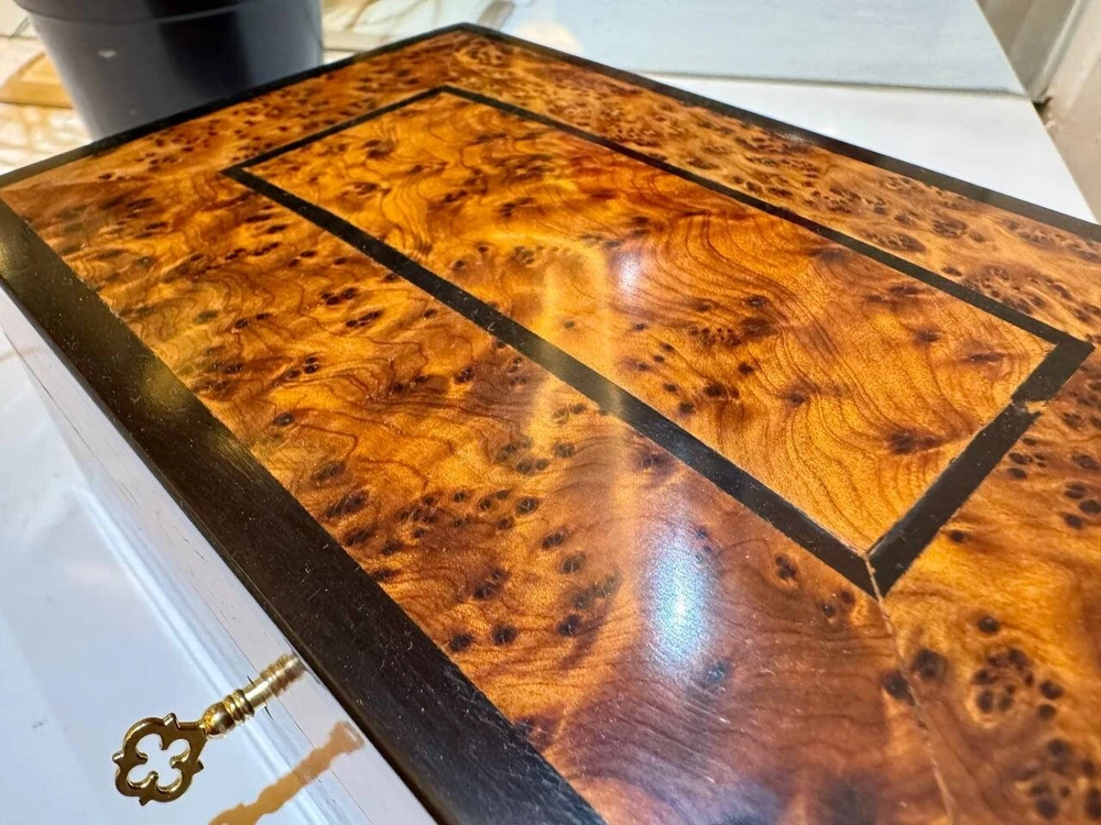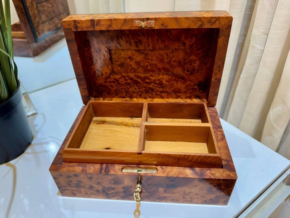 AtlasMuse Handmade Thuya Wooden Box β Crafted with Love by Moroccan Artisans AtlasMuse proudly presents its exquisite Thuya wooden box, meticulously handcrafted by skilled Moroccan artisans. Ideal for storing jewelry, cherished belongings, and important documents, this box combines functionality with timeless elegance. π‘ Quality Assured: Each box is crafted using the finest Thuya root burl wood, with careful moisture management to prevent deformation over time. β¨ Key Features: Three separated compartments inside, with spacious storage underneath (Two Storage Levels). Secure lockable design with a brass key. Customization available: engrave/print text on the lid, leather, or velvet interior lining. π Dimensions: Length: 20 cm / 7.9 inches Width: 13.5 cm / 5.3 inches Height: 8 cm / 3.1 inches π Shipping Details: Your order will be shipped within 1 day of purchase, with express shipping delivering in 3-5 business days. Experience the elegance and craftsmanship of AtlasMuse !