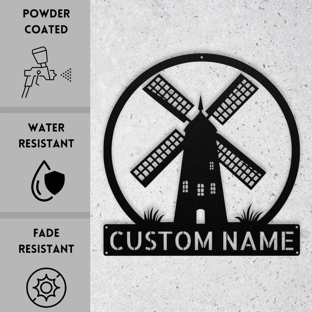 Product Description Custom Fancy Windmill Metal Sign Personalized Home Decor Art Gift Indoor Outdoor Bring a touch of rustic charm to your home with our Custom Fancy Windmill Metal Sign . This beautiful piece of wall art is perfect for adding a personal touch to your decor. Made from high-quality 16-gauge metal , this sign is built to last. Its durable powder coating ensures that it is dust, weather, and water-resistant , making it suitable for both indoor and outdoor use. This personalized metal sign makes an ideal gift for Christmas, birthdays, or any special occasion . You can customize it with a name or special message, making it a unique present for friends or family. Whether displayed in your home, garden, or office, this sign will enhance any space with its charming design. Key Features: Customizable Design : Personalize with a name or message to make it special. Durable Material : Crafted from sturdy 16-gauge metal for long-lasting use. Weather Resistant : Powder-coated finish protects against dust, moisture, and outdoor elements. Versatile Decor : Perfect for both indoor and outdoor settings. Thoughtful Gift Idea : A wonderful present for any occasion, especially for those who appreciate unique decor. Charming Artwork : Features a stylish windmill design that adds character to any space. Celebrate your love for unique home decor or surprise someone special with this Custom Fancy Windmill Metal Sign . Order yours today and make your home truly unique! Service and Color Choice Our metal signs are designed to be personalized just for you, making them the perfect addition to any space! The default color for our signs is Black , but we also offer a variety of beautiful options including Copper, Gold, White, and Silver . After placing your order, simply contact us with your preferred color choice, and we'll ensure your sign is exactly how you envision it. Let’s create something special together!