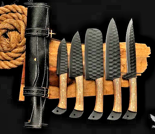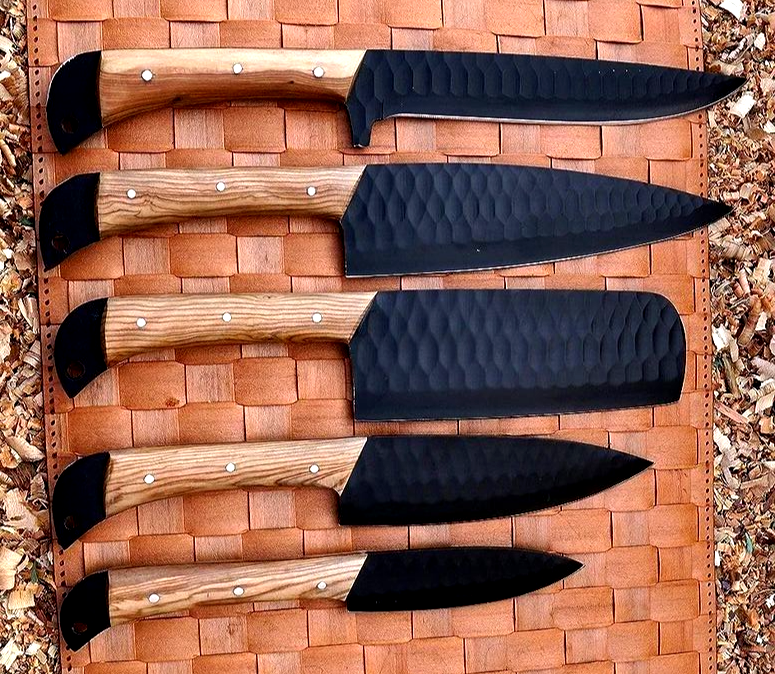 CUSTOM HAND MADE CARBON STEEL HAND FORGED BLADE CHEF KNIFE KITCHEN KNIVES SET Wood Handle This superb design knifes is hand made. Blade of this knife has a nice file work and is made of high carbon steel and hardness 55-58 H R C . This robust knife is lab tested under intense conditions, the balance and shape of this knife ensures perfect grip. Overall Pieces : 5 Cleaver Knife : Blade 6" Inches - Handle 4.75" Inches Fillet Knife : Blade 7.25" Inches - Handle 4.75" Inches Chef Knife : Blade 6.5" Inches - Handle 4.75" Inches Paring Knife : Blade 3.5" Inches - Handle 4.5" Inches Steak Knife : Blade 4.5" Inches - Handle 4.5" Inches Warning: Keep fingers clear of blades. Store away from children.