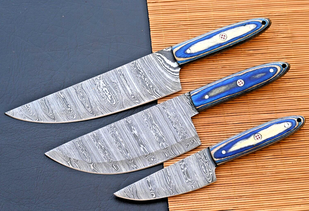 CUSTOM HAND MADE CHEF KNIFE SET HAND FORGED DAMASCUS STEEL BLADE Wood Handle This superb design knife is hand forged. Blade of this knife has a nice file work and is made of 512 layers of 4340 stainless steel and 1075 high carbon steel and hardness 55-58 HRC . This robust knife is lab tested under intense conditions, the balance and shape of this knife ensures perfect grip. Overall Pieces : 3 Utility Knife : Blade 8" Inches - Handle 4.5" Inches Chef Knife : Blade 7" Inches - Handle 4.5" Inches Steak Knife : Blade 4" Inches - Handle 4.5" Inches Damascus Design: Twist Pattern Layers: 512 Hardness: 55-58 HRC Care Instructions: Keep the knife dry after each cleaning. Warning: Keep fingers clear of blades. Store away from children.