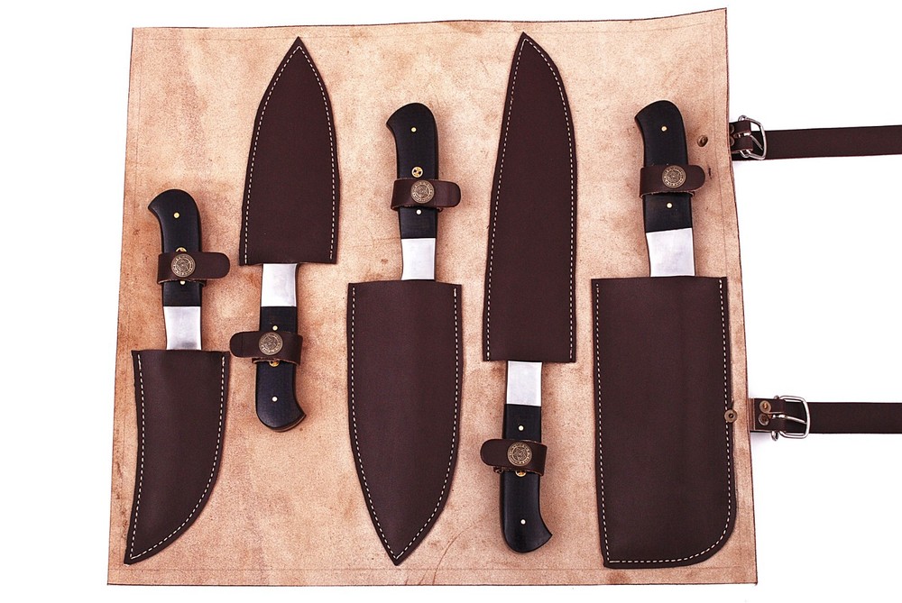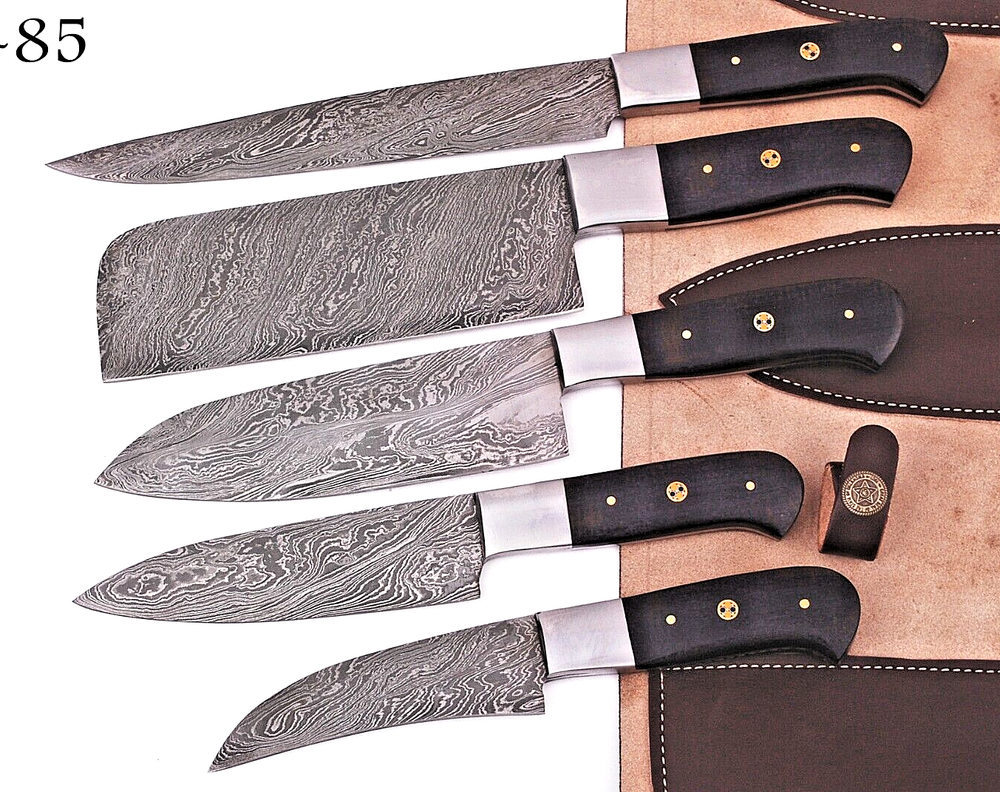 CUSTOM HAND MADE HAND FORGED DAMASCUS STEEL CHEF KNIFE SET Wood & Steel Bolster Handle This superb design knifes is hand forged. Blade of this knife has a nice file work and ismade of 512 layers of 4340 stainless steel and 1075 high carbon steel andhardness 55-58 HRC . This robust knife is lab tested under intense conditions,the balance and shape of this knife ensures perfect grip. Overall pc : 5 Slicing Knife : Blade 7.75" Inches - Handle 4.25" Inches Cleaver Knife : Blade 6" x 2.5" Inches - Handle 4.5" Inches Santoku Knife : Blade 6.25" Inches - Handle 4.75" Inches Steak Knife : Blade 5.5" Inches - Handle 4.25" Inches Paring Knife : Blade 4.5" Inches - Handle 4" Inches Damascus Design: Twist Pattern Layers:512 Package Includes: with Sheath Care Instructions: Keep the knife dry after each cleaning. Warning: Keep fingers clear of blades. Store away from children.