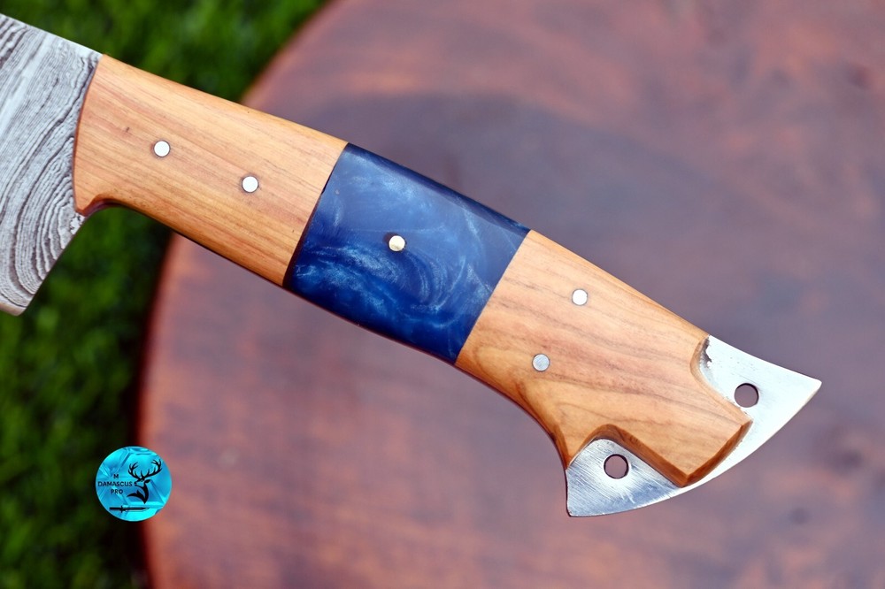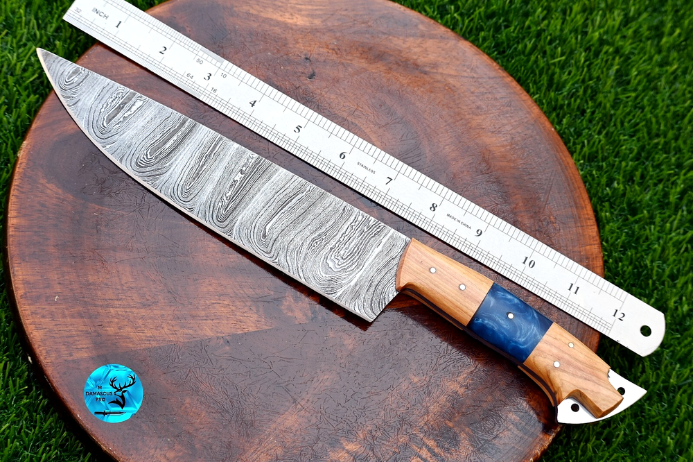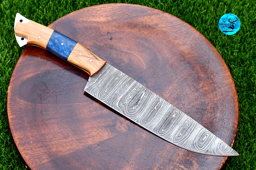 CUSTOM HAND MADE UTILITY CHEF KNIFE FORGED DAMASCUS STEEL BLADE Wood & Resin Handle This superb design knife is hand forged. Blade of this knife has a nice file work and is made of 512 layers of 4340 stainless steel and 1075 high carbon steel and hardness 55-58 HRC . This robust knife is lab tested under intense conditions, the balance and shape of this knife ensures perfect grip. Overall Length: 13" Inches Blade Length: 8" Inches Handle Length: 5" Inches Damascus Design: Twist Pattern Layers: 512 Care Instructions: Keep the knife dry after each cleaning. Warning: Keep fingers clear of blades. Store away from children.