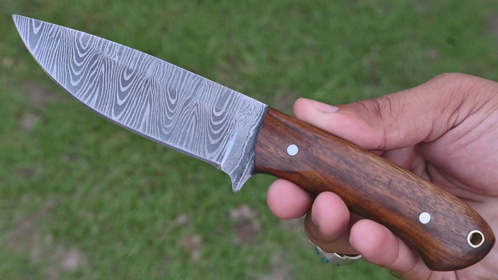 FORGED DAMASCUS STEEL SKINNER KNIFE CUSTOM MADE HAND HUNTING CAMPING SURVIVAL HIKING KNIFE Wood Handle This superb design knife is hand forged. Blade of this knife has a nice file work and is made of 512 layers of 4340 stainless steel and 1075 high carbon steel and hardness 55-58 HRC . This robust knife is lab tested under intense conditions, the balance and shape of this knife ensures perfect grip. Overall Length: 8" Inches Blade Length: 4" Inches Handle Length: 4" Inches Damascus Design: Rain Drop Pattern Layers: 512 Hardness: 55-58 HRC Package Includes: with Leather Sheath Warning: Keep fingers clear of blades. Store away from children.