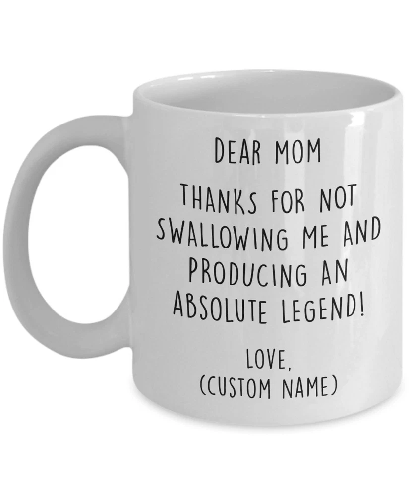Custom Gift For Mom Personalized Mug Thanks For Not Swallowing Me Funny Mothers Product Details.. This high quality 11oz. ceramic white mug has a premium hard coat that provides crisp and vibrant color reproduction sure to last for years. Perfect for all hot & cold beverages. The highest quality printing possible is used. It will never fade no matter how many times you wash it. Material: 100% Ceramic. Print both sides. Dishwasher and Microwave Safe. High Gloss + Premium White Finish. Printed in the U.S.A. Personalized & Custom. We support personalized and custom mug to add custom, when placing an order, you can add notes to the "order note" in shipping address section. Also you can contact us directly via message. Shipping Info. Ready to ship in 1 to 2 business days, All products are made-to-order and proudly printed in the United States. Shipped by USPS and DHL, You will receive your order in 5-7 days. Replace & Refund. All products are defective during shipping broken, chipped will be replaced free of charge. You are not satisfied with the product, we will refund 100% money to you. If any other issues arise, please do not hesitate to message, we would be more than happy to assist you.
