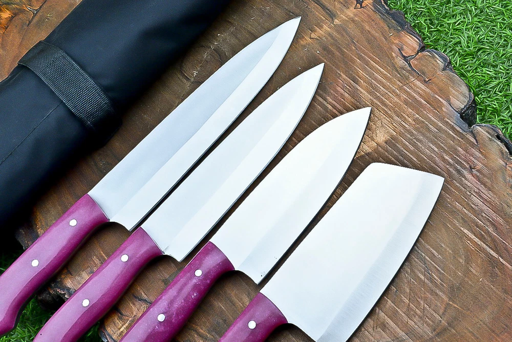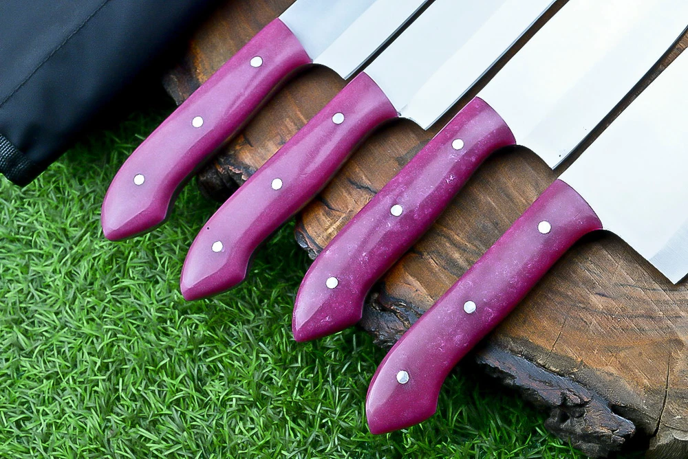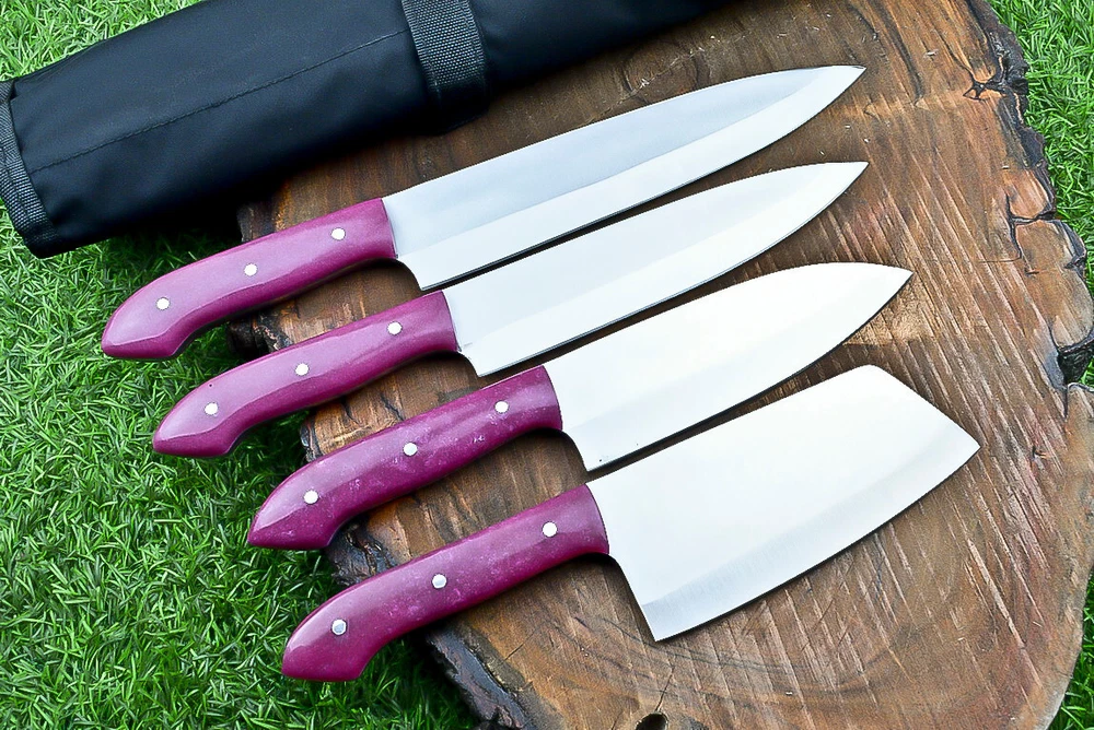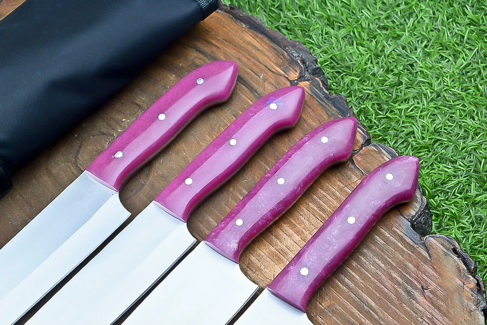 EXCLUSIVE HANDCRAFTED D2 STEEL CHEF KNFIE SET, CHEF KNIVES, KITCHEN KNIVES SET, 4 PCS SET, CAMPING KNIFE, CAMPING KNIFE EDC, Product Details: Overall Knives Length: Approximately 13", 11", 10", 9" inches Blade Length: 8", 7", 6", 5" Blade Material: Genuine D2 Steel Blade Hardness: 54-58 HRC Size Verification: To help you easily determine the size, we've included images with a scale for precise dimension reference. Thank you for your understanding. We appreciate your consideration. Included Accessories: High-quality synthetic fabric (nylon) roll bag with reinforced stitching for durability Handle Material: Resin scales fastened with brass pins. For International Customers: We kindly advise our international customers to familiarize themselves with their country's regulations prior to making a purchase. If customs in your region request customs duties, please be prepared to cover these costs. Regrettably, we cannot assume responsibility, nor issue refunds in such cases. AGE LIMITATION: Please note that we exclusively sell knives to individuals who are 18 years of age or older. Additional Details: Leather Sheath (if pictured): Rest assured, this item comes with a superior-quality, sheath. Crafted with meticulous hand-tooling and stitching, it exemplifies fine craftsmanship and is designed for exceptional durability. The added stitching ensures it withstands years of demanding use, providing reliable protection for your knife throughout its lifetime. Care and Maintenance: When necessary, use a Diamond Wet Stone or a superior sharpening tool to maintain a 20-degree blade edge. After use, clean the item with soap and water, ensure thorough drying, coat it with gun oil, and store it separately from the sheath. Leather absorbs moisture from the air and can lead to blade rust if stored improperly. Customer Feedback: Your satisfaction and feedback are of utmost importance to us. We genuinely appreciate your positive reviews! When assessing shipping time, please consider international transit. Your recognition bolsters our confidence to enhance our services. If you encounter any issues with your order or product dissatisfaction, please reach out to us first. We are committed to resolving any concerns to your satisfaction and kindly request you not to leave neutral or negative feedback. Payments & Returns: All accepted eBay payment methods are available for this purchase. Our return policy typically extends to 14 days. Shipping and Handling: We offer free shipping on all our products (In the USA) Tracking Info: The buyer will receive the tracking number via email (if available). You can also track the shipment in the "Order Details" section on eBay. USPS UPS DHL updates tracking information nightly (if available). Contact: Feel free to contact us anytime via eBay messages. We are dedicated to responding to your inquiries within 24 hours and providing the best possible assistance.
