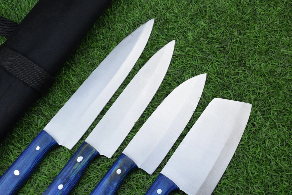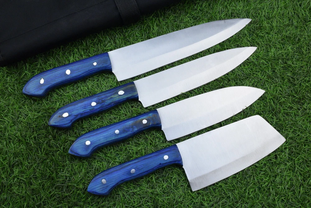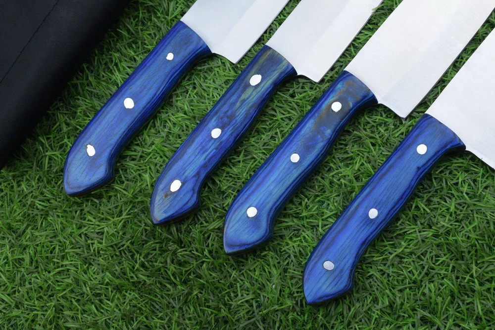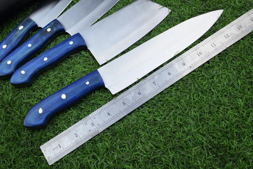 EXCLUSIVE HANDCRAFTED D2 STEEL CHEF KNFIE SET, CHEF KNIVES, KITCHEN KNIVES SET, 4 PCS SET, CAMPING KNIFE, CAMPING KNIFE EDC, Product Details: Overall Knives Length: Approximately 13", 11", 10", 9" inches Blade Length: 8", 7", 6", 5" Blade Material: Genuine D2 Steel Blade Hardness: 54-58 HRC Size Verification: To help you easily determine the size, we've included images with a scale for precise dimension reference. Thank you for your understanding. We appreciate your consideration. Included Accessories: High-quality synthetic fabric (nylon) roll bag with reinforced stitching for durability Handle Material: Wood scales fastened with brass pins. For International Customers: We kindly advise our international customers to familiarize themselves with their country's regulations prior to making a purchase. If customs in your region request customs duties, please be prepared to cover these costs. Regrettably, we cannot assume responsibility, nor issue refunds in such cases. AGE LIMITATION: Please note that we exclusively sell knives to individuals who are 18 years of age or older. Additional Details: Leather Sheath (if pictured): Rest assured, this item comes with a superior-quality, sheath. Crafted with meticulous hand-tooling and stitching, it exemplifies fine craftsmanship and is designed for exceptional durability. The added stitching ensures it withstands years of demanding use, providing reliable protection for your knife throughout its lifetime. Care and Maintenance: When necessary, use a Diamond Wet Stone or a superior sharpening tool to maintain a 20-degree blade edge. After use, clean the item with soap and water, ensure thorough drying, coat it with gun oil, and store it separately from the sheath. Leather absorbs moisture from the air and can lead to blade rust if stored improperly. Customer Feedback: Your satisfaction and feedback are of utmost importance to us. We genuinely appreciate your positive reviews! When assessing shipping time, please consider international transit. Your recognition bolsters our confidence to enhance our services. If you encounter any issues with your order or product dissatisfaction, please reach out to us first. We are committed to resolving any concerns to your satisfaction and kindly request you not to leave neutral or negative feedback. Payments & Returns: All accepted eBay payment methods are available for this purchase. Our return policy typically extends to 14 days. Shipping and Handling: We offer free shipping on all our products (In the USA) Tracking Info: The buyer will receive the tracking number via email (if available). You can also track the shipment in the "Order Details" section on eBay. USPS UPS DHL updates tracking information nightly (if available). Contact: Feel free to contact us anytime via eBay messages. We are dedicated to responding to your inquiries within 24 hours and providing the best possible assistance.
