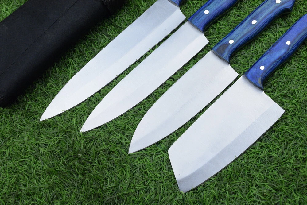 Handle Material: wood Brand: Handmade Food Compatibility: Cheese, Fruit, Meat, Salad, Universal, Vegetables Material: J2 STEEL Country/Region of Manufacture: United States Set Includes: Carving & Slicing Knives, Chef's Knife, Cleaver, Santoku Knife, Utility Knife Blade Edge: Straight Type: Chef's Knife Number of Items in Set: 4