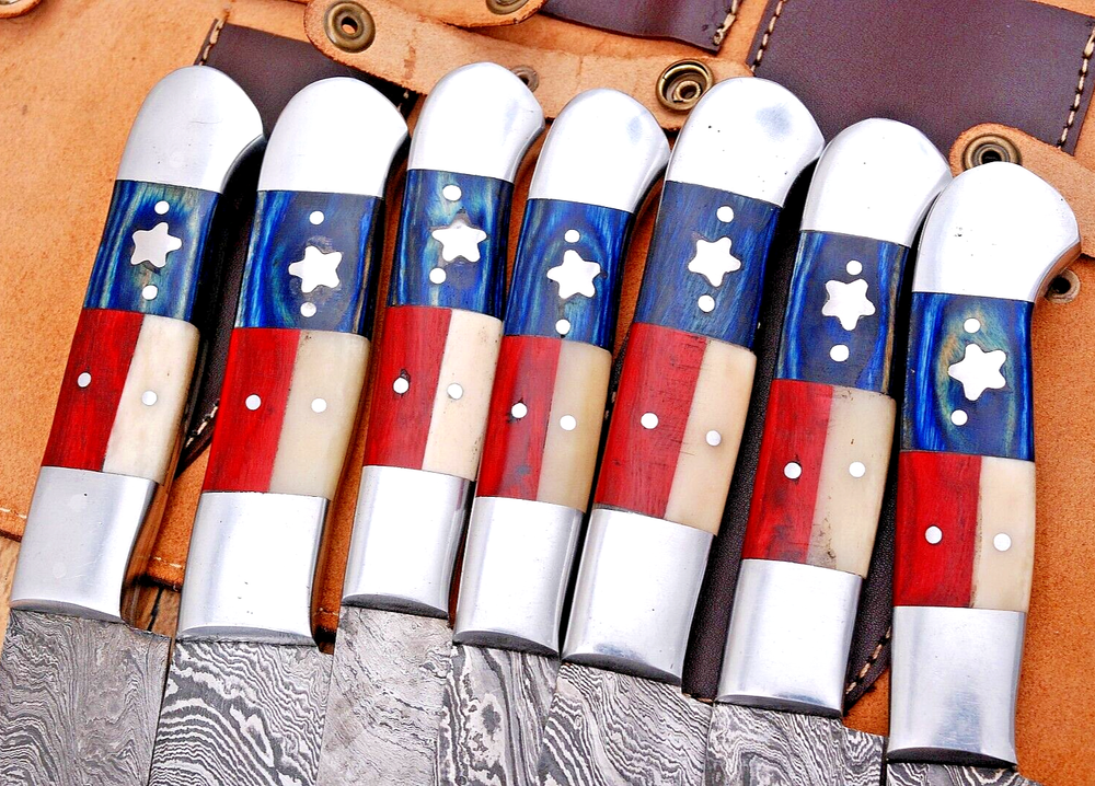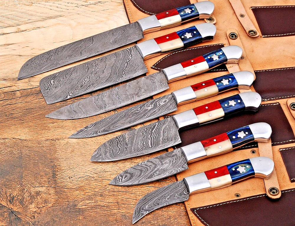 CUSTOM HANDMADE HAND FORGED DAMASCUS STEEL CHEF KNIFE SET KITCHEN KNIFE SET Camel Bone & Wood With Steel Bolster Handle This superb design knifes is hand forged. Blade of this knife has a nice file work and is made of 512 layers of 4340 stainless steel and 1075 high carbon steel and hardness 55-58 H R C . This robust knife is lab tested under intense conditions, the balance and shape of this knife ensures perfect grip. Overall Pieces : 7 Bread Knife : Blade 8" Inches - Handle 4.75" Inches Slicing Knife : Blade 7" Inches - Handle 4.75" Inches Chef Knife : Blade 5" Inches - Handle 4.75" Inches Cleaver Knife : Blade 6.25" Inches - Handle 4.75" Inches fillet Knife : Blade 6.25" Inches - Handle 4.75" Inches Santoku Knife : Blade 4.25" Inches - Handle 4.75" Inches Peel Knife : Blade 3.25" Inches - Handle 4.75" Inches Damascus Design: Twist Pattern Layers:512 Care Instructions: Keep the knife dry after each cleaning. Warning: Keep fingers clear of blades. Store away from children.